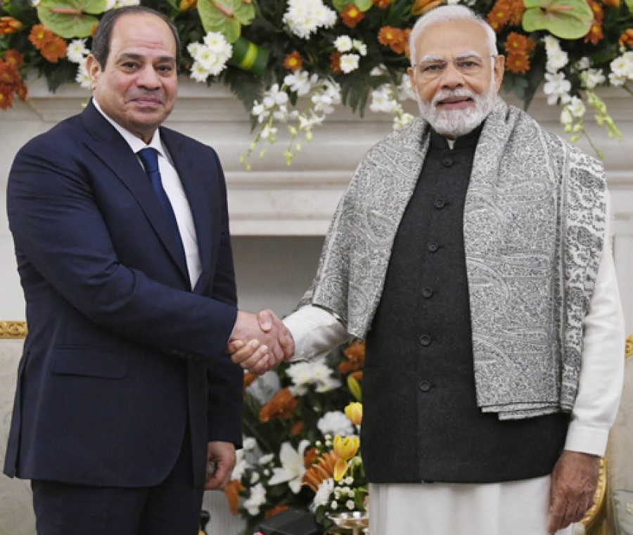 नई दिल्ली। प्रधानमंत्री नरेंद्र मोदी ने भारत के गणतंत्र दिवस समारोह के मुख्य अतिथि मिस्र के राष्ट्रपति अब्देल फतह अल सीसी का गर्मजोशी से स्वागत किया और नई दिल्ली के हैदराबाद हाउस में उनके साथ एक संयुक्त प्रेस वक्तव्य दिया। उन्होंने कहाकि मिस्र के राष्ट्रपति का हमारे गणतंत्र दिवस समारोह में मुख्य अतिथि केरूप में शामिल होना भारत केलिए सम्मान एवं हर्ष का विषय है और उन्हें इस बात कीभी खुशी हैकि मिस्र की एक सैन्य टुकड़ी भी हमारे गणतंत्र दिवस में भाग लेकर परेड की शोभा बढ़ा रही है। प्रधानमंत्री ने कहाकि भारत और मिस्र विश्व की सबसे पुरानी सभ्यताओं मेसे हैं, हमारे बीच कई हज़ार वर्ष का अनवरत नाता है। उन्होंने उल्लेख कियाकि चार हजार वर्ष सेभी पहले गुजरात के लोथल पोर्ट केमाध्यम से मिस्र केसाथ व्यापार होता था, विश्व में विभिन्न परिवर्तनों के बावजूद हमारे संबंधों में एक स्थिरता रही है और हमारा सहयोग भी निरंतर सुदृढ़ रहा है। प्रधानमंत्री ने राष्ट्रपति अब्देल फतह अल सीसी केसाथ आए प्रतिनिधिमंडल का भी हार्दिक स्वागत किया।