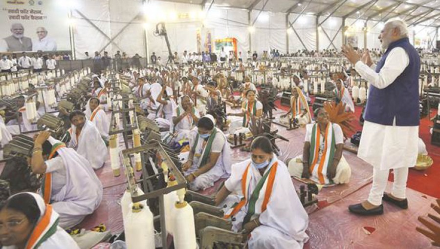 प्रधानमंत्री नरेंद्र मोदी ने अपने मासिक रेडियो प्रसारण कार्यक्रम मन की बात के माध्यम से खादी को खरीदने केलिए देशवासियों से कईबार अपील की है। उन्होंने विशेष रूपसे युवाओं का इस पहल में जुड़ने का आह्वान किया है, जिसके सकारात्मक असर से साल दर साल खादी उत्पादों की रिकॉर्ड बिक्री हुई है। प्रधानमंत्री ने खादी को लोकप्रिय बनाने केलिए बार-बार खादी फॉर नेशन, खादी फॉर फैशन एंड खादी फॉर ट्रांसफॉर्मेशन के आदर्श वाक्य केसाथ खादी को अपनाने तथा उत्पादन एवं बिक्री बढ़ाने के हर संभव प्रयास की सराहना की है। वित्तीय वर्ष 2021-2022 में खादी और ग्रामोद्योग उत्पादों का उत्पादन 84,290 करोड़ का और बिक्री 1,15,415 करोड़ की हुई थी। इस साल 2 अक्टूबर को खादी इंडिया के कनॉट प्लेस बिक्री केंद्र ने एकही दिन में 1.34 करोड़ रुपये की खादी उत्पाद बेचने का नया रिकॉर्ड बनाया है, जिसका श्रेय प्रधानमंत्री द्वारा देशकी जनता को आह्वान को जाता है। इसके अलावा खादी उत्पादन एवं विक्रय कार्य में लगे लाखों कारीगरों और अथक परिश्रम खादी श्रमिकों की भी इस कार्य में अत्यंत महत्वपूर्ण भूमिका है।