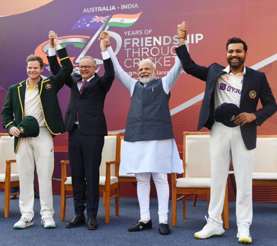 अहमदाबाद। प्रधानमंत्री नरेंद्र मोदी और ऑस्ट्रेलिया के प्रधानमंत्री एंथनी अल्बानीस साथ-साथ अहमदाबाद नरेंद्र मोदी स्टेडियम में बॉर्डर गावस्कर ट्रॉफी के चौथे स्मारक क्रिकेट टेस्ट मैच देखने पहुंचे। प्रधानमंत्री नरेंद्र मोदी ने इस दौरान क्रिकेट ग्राउंड पर जाकर टीम इंडिया के कप्तान रोहित शर्मा को टेस्ट कैप सौंपी, जबकि ऑस्ट्रेलियाई प्रधानमंत्री ने ऑस्ट्रेलियाई कप्तान स्टीव स्मिथ को टेस्ट कैप सौंपी। इसके बाद प्रधानमंत्री नरेंद्र मोदी और ऑस्ट्रेलियाई प्रधानमंत्री ने स्टेडियम में भारी भीड़ के सामने एक गोल्फ कार्ट में गार्ड ऑफ ऑनर लिया। भारत-ऑस्ट्रेलियाई टीमों के कप्तान जहां टॉस केलिए पिच पर पहुंचे, वहीं प्रधानमंत्री और ऑस्ट्रेलियाई प्रधानमंत्री स्टेडियम का मुआयना करते हुए फ्रेंडशिप हॉल ऑफ फेम की ओर बढ़े।