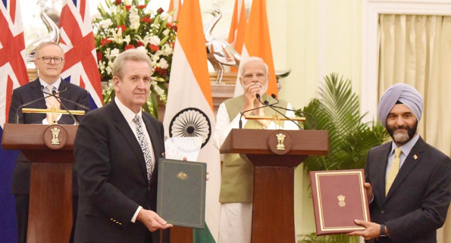 प्रधानमंत्री नरेंद्र मोदी ने कहाकि हमने भारत-प्रशांत क्षेत्र में मैरीटाइम सिक्युरिटी, आपसी रक्षा और सुरक्षा सहयोग बढ़ाने एवं सहयोग के विभिन्न पहलुओं पर चर्चा की और सुरक्षा सहयोग हमारी व्यापक रणनीतिक साझेदारी का एक महत्वपूर्ण स्तंभ है। प्रधानमंत्री ने कहाकि रक्षा क्षेत्र में हमने पिछले कुछ साल में उल्लेखनीय समझौते किए हैं, जिनमें एकदूसरे की सेनाओं केलिए रसद समर्थन भी शामिल है। उन्होंने कहाकि हमारी सुरक्षा एजेंसियों केबीच नियमित और उपयोगी सूचना का आदान-प्रदान है, हमने इसे और सुदृढ़ करने पर चर्चा की है, हमारे युवा सैनिकों केबीच संपर्क और मित्रता बढ़ाने केलिए हमने जनरल रावत ऑफिसर्स एक्सचेंज प्रोग्राम की स्थापना की है, जो इसी महीने आरंभ हुआ है। नरेंद्र मोदी ने कहाकि आज हमने विश्वस्त और मजबूत वैश्विक सप्लाई चेंस विकसित करने केलिए आपसी सहयोग पर विचार-विमर्श किया, नवीकरणीय ऊर्जा दोनों देशों केलिए प्राथमिकता और फोकस का क्षेत्र हैं और हम क्लीन हाइड्रोजन सोलर में साथ मिलकर काम कर रहे हैं। उन्होंने कहाकि पिछले साल लागू हुए व्यापार समझौता (एकता) से दोनों देशों केबीच व्यापार और निवेश के बेहतर अवसर खुले हैं और हमारी टीमें व्यापक आर्थिक सहयोग समझौते पर भी काम कर रही हैं।