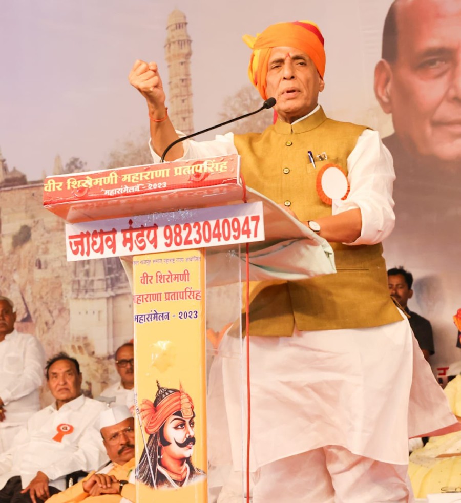 संभाजीनगर (महाराष्ट्र)। रक्षामंत्री राजनाथ सिंह ने कहा हैकि सीमाओं की सुरक्षा, लोगों की सुरक्षा और देश की एकता अखंडता एवं संप्रभुता की रक्षा करना सरकार की सर्वोच्च प्राथमिकता है और नरेंद्र मोदी सरकार देश को हर तरह के खतरों से सुरक्षित रखने और विकास की राह पर अभूतपूर्व गति से आगे रखने केलिए हरसंभव प्रयास कर रही है। उन्होंने कहाकि मोदी सरकार में देश हर तरह के खतरे से सुरक्षित है। रक्षामंत्री ने महाराष्ट्र के छत्रपति संभाजीनगर में वीर शिरोमणि महाराणा प्रताप महासम्मेलन में ये बातें कहीं। उन्होंने कहाकि महाराणा प्रताप भारतीय इतिहास के ऐसे महानायक हैं, जिन्होंने अपनी मातृभूमि के मान, सम्मान और स्वाभिमान की रक्षा केलिए अपना सर्वस्व न्यौछावर कर दिया था, मैं उनकी स्मृति को नमन करता हूं।