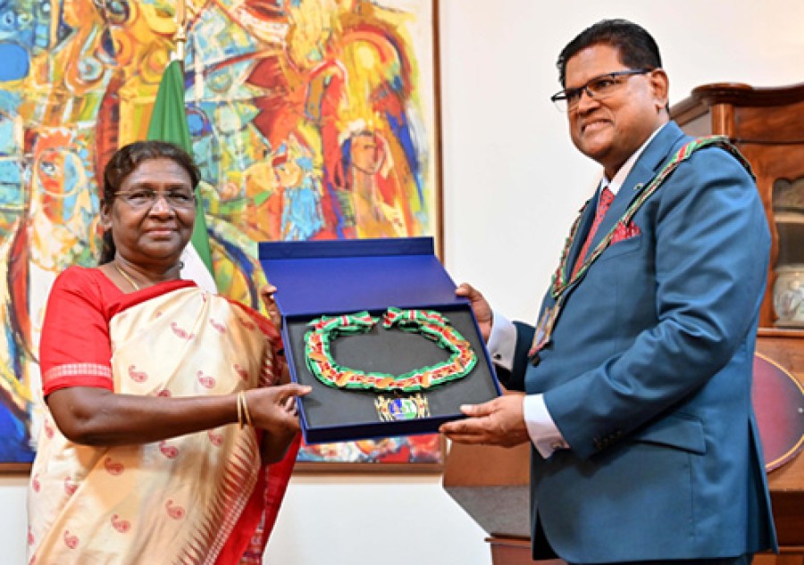 पारामारिबो/ नई दिल्ली। राष्ट्रपति द्रौपदी मुर्मू को सूरीनाम के सर्वोच्च सम्मान 'ग्रैंड ऑर्डर ऑफ़ द चेन ऑफ़ द येलो स्टार' से सम्मानित किया गया है, जो उन्हें सूरीनाम के राष्ट्रपति चंद्रिका प्रसाद संतोखी ने एक भव्य समारोह में प्रदान किया। राष्ट्रपति द्रौपदी मुर्मू ने इस अवसर पर कहाकि यह मान्यता न केवल उनके लिए, बल्कि भारत के उन 1.4 अरब लोगों केलिए भी अत्यधिक महत्व रखती है, जिनका वे प्रतिनिधित्व करती हैं। राष्ट्रपति ने उन्हें यह सम्मान प्रदान करने केलिए राष्ट्रपति संतोखी और सूरीनाम सरकार को धन्यवाद दिया। उन्होंने यह सम्मान भारतीय-सूरीनाम समुदाय की आनेवाली पीढ़ियों को भी समर्पित किया, जिन्होंने दोनों देशों केबीच भ्रातृत्व संबंधों को समृद्ध करने में महत्वपूर्ण भूमिका निभाई है। द्रौपदी मुर्मू ने राष्ट्रपति चंद्रिका प्रसाद संतोखी केसाथ राजधानी पारामारिबो में सूरीनाम में भारतीयों के आगमन के 150 वर्ष पूरे होने के उपलक्ष्य में सांस्कृतिक उत्सव में भाग लिया।