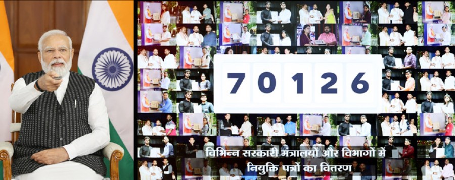 नई दिल्ली। प्रधानमंत्री नरेंद्र मोदी ने आज वीडियो कांफ्रेंसिंग के जरिए राष्ट्रीय रोज़गार मेले को संबोधित किया और विभिन्न सरकारी विभागों और संगठनों में नवनियुक्त भर्ती केलिए लगभग 70000 नियुक्ति पत्र वितरित किए। देशभर से चयनित भर्तियां वित्तीय सेवा विभाग, डाक विभाग, स्कूल शिक्षा विभाग, उच्चशिक्षा विभाग, रक्षा मंत्रालय, राजस्व विभाग, स्वास्थ्य और परिवार कल्याण मंत्रालय, परमाणु ऊर्जा विभाग, रेल मंत्रालय, लेखा परीक्षा और लेखा विभाग एवं गृह मंत्रालय सहित विभिन्न सरकारी विभागों में शामिल होंगी। प्रधानमंत्री ने रोज़गार मेले को संबोधित करते हुए टिप्पणी कीकि अब देश तय करेगा कि युवाओं का भविष्य रेट कार्ड से चलेगा या सेफगार्ड से। उन्होंने भर्ती प्रक्रिया में वंशवाद की राजनीति और भाई-भतीजावाद की बुराइयों के बारेमें बात की। उन्होंने 'नौकरियों केलिए नकद घोटाले' के मुद्दे पर प्रकाश डाला, जोकि एक राज्य में सामने आया है और युवाओं को इस तरह की प्रणाली के बारेमें चेतावनी दी।