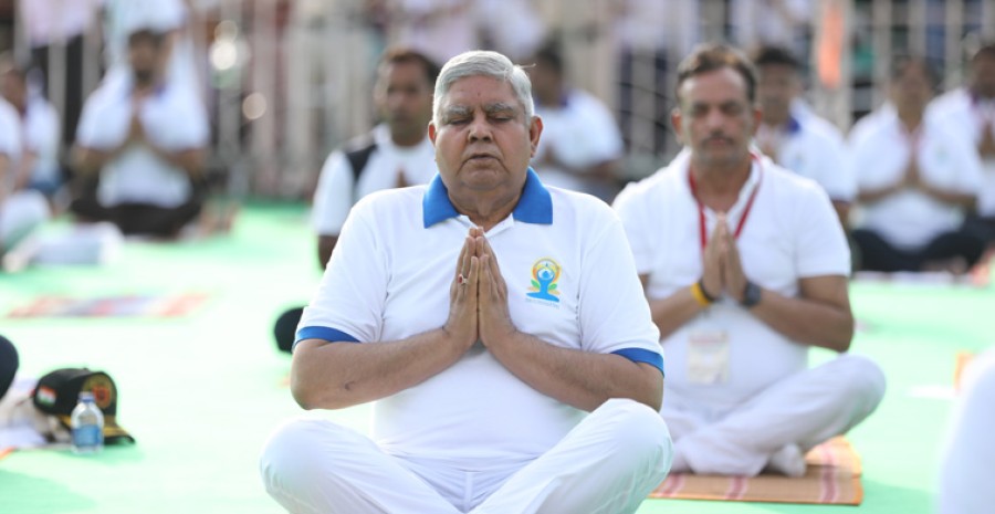 अमेरिका, यूके, फ्रांस, जर्मनी के सम्मिलित डिजिटल लेनदेन पर जगदीप धनखड़ ने कहाकि यहांके चार गुना से भी अधिक डिजिटल लेनदेन भारत में हुआ। उन्होंने कहाकि भारतीयता की खासियत हैकि हम स्किल को तुरंत ही सीख लेते हैं, वर्ष 2022 में हमारे 70 करोड़ इंटरनेट उपभोक्ताओं ने प्रति व्यक्ति जितना कंजप्शन किया, वो अमेरिका और चीन से अधिक है। उपराष्ट्रपति ने विश्वास जतायाकि 2047 तक जब देश अपनी आजादी की 100वीं वर्षगांठ मनाएगा, हम विश्वगुरु के रूपमें दुनिया के सर्वोच्च शिखर पर होंगे। अंतर्राष्ट्रीय योग दिवस समारोह में मध्य प्रदेश के राज्यपाल मंगूभाई पटेल, मुख्यमंत्री शिवराज सिंह चौहान, केंद्रीय आयुष मंत्री सर्बानंद सोनोवाल, पद्मभूषण से सम्मानित रामचंद्र मिशन के अध्यक्ष दाजी कमलेश पटेल, सांसद, विधायक, जनप्रतिनिधि और गणमान्य नागरिकों ने भाग लिया।