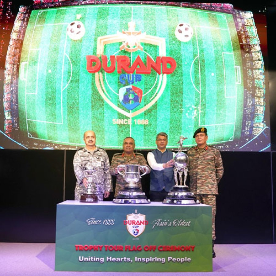 फुटबॉल टूर्नामेंट डूरंड कप ट्रॉफी टूर के हिस्से के रूपमें अगले एक महीने में तीन ट्रॉफियां मेगा इवेंट केलिए कोलकाता पहुंचने से पहले देशभर में घूमेंगी और शिमला, उधमपुर, जयपुर, मुंबई, पुणे, बेंगलुरु, भुवनेश्वर, कोकराझार, गुवाहाटी और शिलांग जैसे कुछ प्रमुख शहरों में प्रदर्शित होंगी। टूर्नामेंट के 132वें संस्करण में नेपाल, भूटान और बांग्लादेश की टीमों सहित 24 टीमें भाग लेंगी। विदेशी टीमें 27 साल के अंतराल के बाद टूर्नामेंट में हिस्सा ले रही हैं। मूल रूपसे टूर्नामेंट हमेशा खेल के क्षेत्र में उत्कृष्टता, खेल कौशल और प्रतिस्पर्धात्मकता के उच्च बिंदु का प्रतीक रहा है। बड़ी संख्या में उपस्थित लोगों में युवा फुटबॉल प्रेमी और प्रतिष्ठित खेल हस्तियां शामिल थीं।