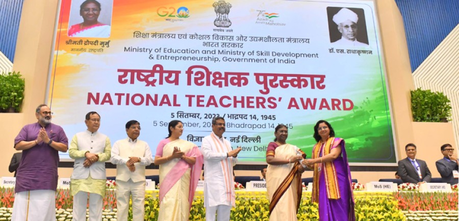 नई दिल्ली। राष्ट्रपति द्रौपदी मुर्मु ने शिक्षक दिवस पर विज्ञान भवन नई दिल्ली में समारोहपूर्वक उत्कृष्ट शैक्षणिक कार्यों एवं पहलों केलिए देशभर से चयनित शिक्षकों को राष्ट्रीय पुरस्कार प्रदान किए। राष्ट्रपति ने इस अवसर पर कहाकि महान शिक्षाविद्, असाधारण शिक्षक और भारत के राष्ट्रपति रहे डॉ सर्वपल्ली राधाकृष्णन की जयंती मनाई जा रही है, वे चाहते थेकि उनके जन्मदिन को शिक्षक दिवस के रूपमें मनाया जाए। राष्ट्रपति ने शिक्षक दिवस पर राष्ट्रीय पुरस्कार से सम्मानित शिक्षकों को बधाई देते कहाकि वह समझती हैंकि यह दिन विशेष रूपसे हर व्यक्ति को अपने विद्यार्थी जीवन की याद दिलाता है और अपने शिक्षक भी याद दिलाता है, इस दिन उन्हें अपने आदरणीय शिक्षक तो याद आते ही हैं, वे बच्चे भी याद आते हैं, जिन्हें उन्होंने ओडिशा के रायरंगपुर में श्री ऑरोबिंदो इंटीग्रल स्कूल में पढ़ाया था और उन बच्चों के प्यार को वे अपने जीवन की सबसे बड़ी उपलब्धियों में शामिल करती हैं।