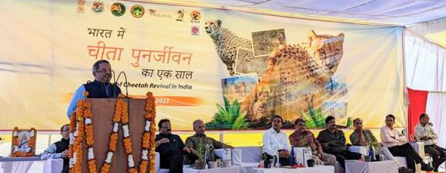 भोपाल। भारत में प्रोजेक्ट चीता के सफल कार्यांवयन के एक वर्ष होने पर सेसईपुरा वन परिसर कूनो राष्ट्रीय उद्यान मध्य प्रदेश में एक कार्यक्रम हुआ, जिसमें उल्लेख किया गयाकि 17 सितंबर 2022 को भारत ने वन्यजीव संरक्षण के क्षेत्र में एक इतिहास बनाया था, जब धरती पर सबसे तेजी से दौड़ने वाला जानवर विलुप्त होने के लगभग 75 वर्ष केबाद आखिरकार भारत लौट आया। प्रधानमंत्री नरेंद्र मोदी ने पहल करके भारत में विलुप्त होने के दशकों बाद पहलीबार अंतरमहाद्वीपीय वन्यजीव स्थानांतरण में आठ अफ्रीकी चीतों को नामीबिया से मध्यप्रदेश के कूनो राष्ट्रीय उद्यान में स्थानांतरित कराया था। इसके बाद दक्षिण अफ्रीका के बारह चीतों को भी स्थानांतरित कराया गया और उन्हें फरवरी 2023 में कूनो नेशनल पार्क में छोड़ दिया गया। यह प्राकृतिक धरोहरों को बहाल करने में भारत की एक बड़ी उपलब्धि का प्रतिनिधित्व करता है। इस परियोजना को नामीबिया, दक्षिण अफ्रीका और भारत से संबंधित सरकारी अधिकारियों, वैज्ञानिकों, वन्यजीव जीवविज्ञानी और पशु चिकित्सकों की विशेषज्ञ टीम की देखरेख में लागू किया गया था।