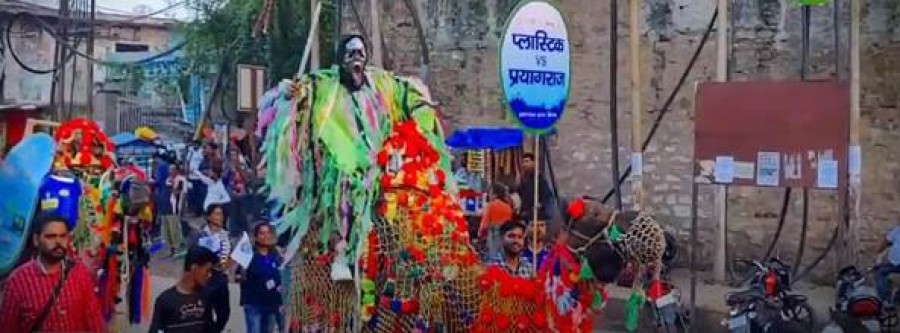 खैर अभीतक तो आपने प्लास्टिक के बैन होने, उसके खिलाफ एक्शन और रिकवरी होने, बैन हो चुकी प्लास्टिक के इस्तेमाल पर चालान या 'सिंगल यूज प्लास्टिक को ना' कहने केलिए प्रेरित करने वाले जागरुकता अभियान के बारेमें ही देखा या सुना होगा। सभी मामलों में प्लास्टिक निर्जीव होती है, कहने का मतलब जिंदा नहीं होती। सुनकर भले ही हैरानी हो, मगर प्रयागराज में यह जो विदाई यात्रा निकाली गई, उसमें प्लास्टिक जिंदा नज़र आई। इस अनोखी विदाई यात्रा में कई बातें निराली थीं, क्योंकि यहां प्लास्टिक जिंदा ही नहीं, बल्कि काफी भयानक और हिंसक प्रवृत्ति की दिखाई दी, जिसके हाथ में तलवार भी थी। दरअसल इस यात्रा में प्लास्टिक रूपी दानव दिखाया गया, जो तलवार लेकर मजाकिया अंदाज में ही सही लोगों की जान लेने को तैयार बैठा था। बाकायदा एक बग्गी के आगे प्लास्टिक की विदाई यात्रा का बैनर लेकर निगमकर्मी चल रहे थे। किसी बारात की तरह ढोल नगाड़े बजाए गए और दूल्हे की तरह प्लास्टिक के वेश में एक व्यक्ति ऊंट पर बैठा हुआ था।