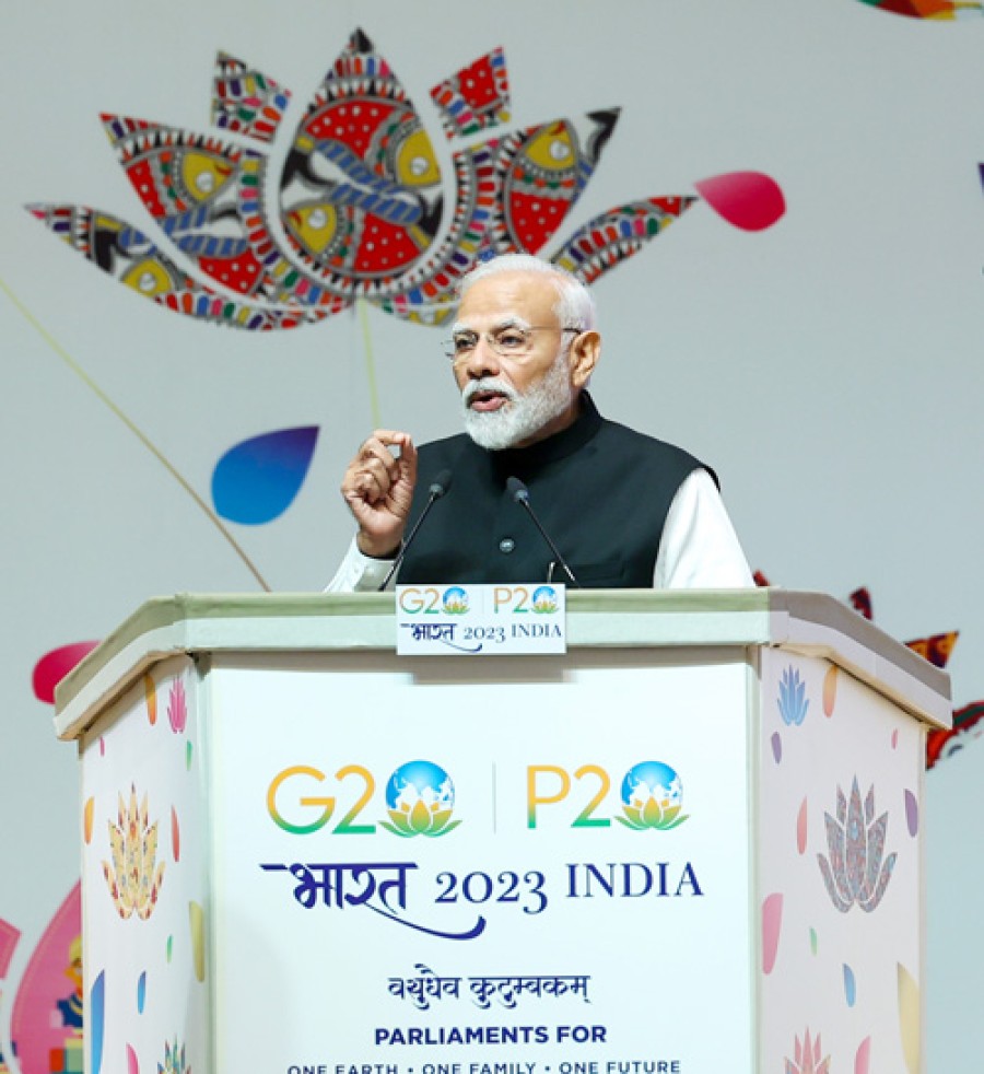 प्रधानमंत्री नरेंद्र मोदी ने कहाकि इन समारोहों को चंद्रयान की चंद्रमा पर लैंडिंग, एक सफल जी-20 शिखर सम्मेलन और पी-20 शिखर सम्मेलन जैसे कार्यक्रमों से और अधिक प्रोत्साहन मिला। उन्होंने कहाकि किसीभी राष्ट्र की सबसे बड़ी ताकत उसके लोग और उनकी इच्छा शक्ति होती है और यह शिखर सम्मेलन उसीके आयोजन का एक माध्यम है। प्रधानमंत्री ने कहाकि पी-20 शिखर सम्मेलन उस भूमि पर हो रहा है, जो न केवल लोकतंत्र की जननी के रूपमें जानी जाती है, बल्कि विश्व का सबसे बड़ा लोकतंत्र भी है। विश्वभर की विभिन्न संसदों के प्रतिनिधियों के रूपमें प्रधानमंत्री ने बहस, विचार-विमर्श के महत्व को रेखांकित किया और अतीत में हुई ऐसी बहसों के सटीक उदाहरणों का उल्लेख किया। उन्होंने बतायाकि भारत के पांच हजार वर्ष पुराने वेदों, शास्त्रों में विधानसभाओं और समितियों का उल्लेख मिलता है, जहां समाज के कल्याण केलिए सामूहिक निर्णय लिए जाते थे। भारत के सबसे पुराने धर्मग्रंथ ऋग्वेद की चर्चा करते हुए प्रधानमंत्री ने एक संस्कृत श्लोक का पाठ किया जिसका अर्थ है 'हमें एकसाथ चलना चाहिए, एकसाथ बोलना चाहिए और हमारे विचार आपस में जुड़े होने चाहिए'। उन्होंने बतायाकि ग्रामीण स्तर से संबंधित मुद्दों का समाधान बहस में शामिल करने से किया गया, जो यूनानी राजदूत मेगस्थनीज केलिए अत्यंत कौतुहल का विषय बन गया था, जिन्होंने इसके बारेमें बहुत विस्तार से लिखा था।