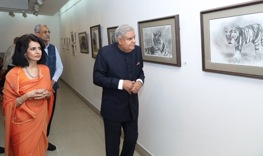 नई दिल्ली। उपराष्ट्रपति जगदीप धनखड़ ने नई दिल्ली में ऑल इंडिया फाइन आर्ट्स सोसाइटी में जानी मानी कलाकार चारुमती निर्वाण की बाघों के चित्रों पर आधारित प्रदर्शनी का उद्घाटन किया। 'गर्जना भरा पुनरुत्थान भारत के बाघ' शीर्षक वाली इस प्रदर्शनी में चारकोल से बने बाघ रेखाचित्रों और जलरंगों से बने पुष्पों को प्रदर्शित किया गया है। चारुमती निर्वाण कला के माध्यम से प्रकृति संरक्षण के बारेमें लोगों को जागरुक करने का कार्य कर रही हैं और यह उनकी पांचवीं ऐसी प्रदर्शनी है।