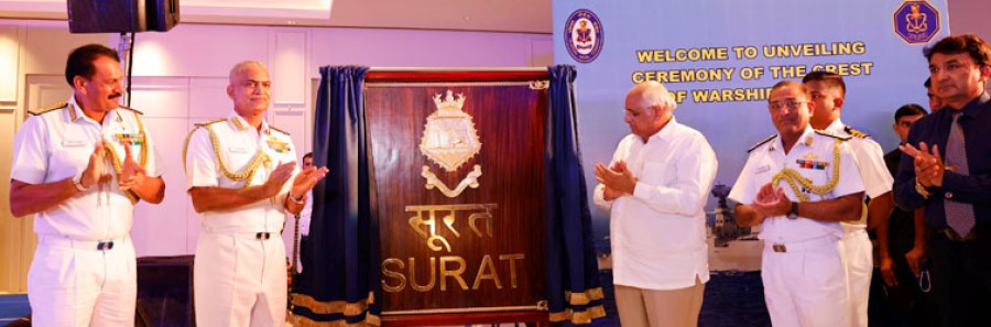 सूरतनगर। गुजरात के मुख्यमंत्री भूपेंद्र पटेल ने भारतीय नौसेना के नवीनतम निर्माणाधीन निर्देशित मिसाइल विध्वंसक सूरत के शिखर का नौसेना प्रमुख एडमिरल आर हरिकुमार, राज्य सरकार और भारतीय नौसेना के वरिष्ठ अधिकारियों केसाथ सूरतनगर में समारोहपूर्वक अनावरण किया। सूरत का शिखर खंभात की खाड़ी के दक्षिणी प्रवेश द्वार पर हजीरा यानी सूरत के प्रसिद्ध प्रकाश स्तंभ को दर्शाता है। वर्ष 1836 में निर्मित यह लाइटहाउस भारत के सबसे पहले के लाइटहाउसों में से एक था। शिखर पर एशियाई शेर, जोकि गुजरात का राज्य पशु भी है, इस पोत की महिमा और शक्ति का प्रतीक बन गया है। नौसैनिक युद्ध प्रौद्योगिकी और लड़ाकू क्षमताओं में नवीनतम प्रगति से सुसज्जित युद्धपोत सूरत समुद्री सुरक्षा और राष्ट्रीय रक्षा केलिए नौसेना की प्रतिबद्धता का शक्तिशाली अवतार है।
