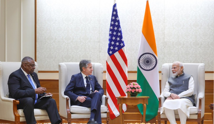 नई दिल्ली। अमेरिका के विदेश मंत्री एंटनी ब्लिंकन और रक्षामंत्री लॉयड ऑस्टिन ने प्रधानमंत्री नरेंद्र मोदी से नई दिल्ली में मुलाकात की। दोनों अमेरिकी मंत्रियों ने प्रधानमंत्री को 2+2 वार्ता में भारत के रक्षामंत्री राजनाथ सिंह और विदेश मंत्री डॉ एस जयशंकर केसाथ हुए अपने व्यापक और गहन विचार-विमर्श की जानकारी दी। उन्होंने जून 2023 में प्रधानमंत्री नरेंद्र मोदी की अमेरिका की राजकीय यात्रा और नई दिल्ली में जी20 शिखर सम्मेलन में अमेरिकी राष्ट्रपति जो बाइडेन केबीच हुई बैठक केबाद रक्षा, सेमीकंडक्टर, उभरती प्रौद्योगिकी, अंतरिक्ष, स्वास्थ्य सहित द्विपक्षीय सहयोग के विभिन्न क्षेत्रों में हुई प्रगति पर भी प्रकाश डाला।