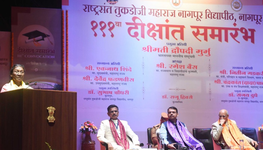 राष्ट्रपति द्रौपदी मुर्मु ने कहाकि विश्वविद्यालय की अपनी एक समृद्धशाली विरासत है, यहां के पूर्व विद्यार्थियों ने राजनीति, न्यायपालिका, विज्ञान और समाजसेवा जैसे क्षेत्रों में अभूतपूर्व योगदान दिया है, पूर्व प्रधानमंत्री पीवी नरसिम्हा राव, भारत के पूर्व मुख्य न्यायाधीश जस्टिस एम हिदायतुल्ला और जस्टिस शरद अरविंद बोबडे जैसे प्रख्यात लोग इस विश्वविद्यालय के छात्र रहे हैं और आज हमारे बीच विश्वविद्यालय के दो पूर्व छात्र इस मंच पर भी उपस्थित हैं-नितिन गडकरी और महाराष्ट्र के उपमुख्यमंत्री देवेंद्र फड़नवीस, दोनों पर न केवल विश्वविद्यालय, बल्कि महाराष्ट्र और भारतभर को गर्व है। राष्ट्रपति ने कहाकि अनुसंधान और नवोन्मेषण किसीभी देश के विकास में महत्वपूर्ण भूमिका निभाते हैं और उन्हें यह जानकर प्रसन्नता हैकि राष्ट्रसंत तुकड़ोजी महाराज नागपुर विश्वविद्यालय अनुसंधान, नवोन्मेषण और प्रौद्योगिकी विकास को प्रोत्साहित कर रहा है। उन्होंने कहाकि विश्वविद्यालय के संकाय सदस्यों को भारतीय पेटेंट कार्यालय ने 60 से अधिक पेटेंट प्रदान किए हैं।