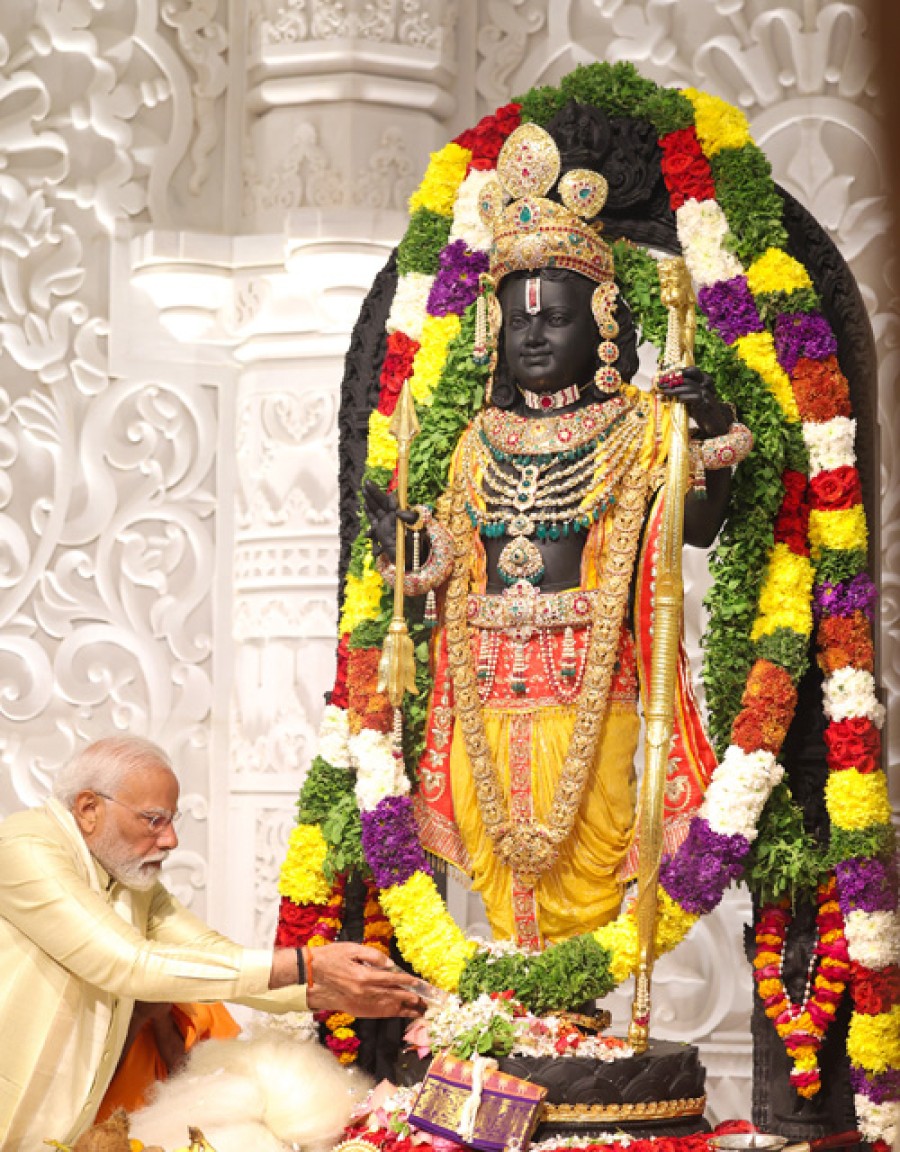 प्रधानमंत्री ने कहाकि कल मैं श्रीराम के आशीर्वाद से धनुषकोडि में रामसेतु के आरंभ बिंदु अरिचल मुनाई पर था, जिस घड़ी प्रभु श्रीराम समुद्र पार करने निकले थे वो एक पल था, जिसने कालचक्र को बदला था, उस भावमय पल को महसूस करने का मेरा ये विनम्र प्रयास था, वहां पर मैंने पुष्प वंदना की, वहां मेरे भीतर एक विश्वास जगाकि जैसे उस समय कालचक्र बदला था, उसी तरह अब कालचक्र फिर बदलेगा और शुभ दिशा में बढ़ेगा। प्रधानमंत्री ने कहाकि अपने 11 दिन के व्रत-अनुष्ठान के दौरान मैंने उन स्थानों का चरण स्पर्श करने का प्रयास किया, जहां प्रभु श्रीराम के चरण पड़े थे, चाहे वो नासिक का पंचवटी धाम हो, केरला का पवित्र त्रिप्रायर मंदिर हो, आंध्र प्रदेश में लेपाक्षी हो, श्रीरंगम में रंगनाथ स्वामी मंदिर हो, रामेश्वरम में श्रीरामनाथस्वामी मंदिर हो या फिर धनुषकोडि, मेरा सौभाग्य हैकि इसी पुनीत पवित्र भाव केसाथ मुझे सागर से सरयू तककी यात्रा का अवसर मिला, सागर से सरयू तक हर जगह श्रीराम नाम का वही उत्सव भाव छाया हुआ है, प्रभु श्रीराम तो भारत की आत्मा के कण-कण से जुड़े हुए हैं, भारतवासियों के अंतर्मन में विराजे हुए हैं। प्रधानमंत्री ने कहाकि हम भारत में कहीं भी, किसी की अंतरात्मा को छुएंगे तो इस एकत्व की अनुभूति होगी और यही भाव सब जगह मिलेगा, इससे उत्कृष्ट, इससे अधिक देश को समायोजित करने वाला सूत्र और क्या हो सकता है? प्रधानमंत्री ने कहाकि मुझे देश के कोने-कोने में अलग-अलग भाषाओं में रामायण सुनने का अवसर मिला है, लेकिनविशेषकर पिछले 11 दिन में रामायण अलग-अलग भाषा, अलग-अलग राज्यों से मुझे विशेष रूपसे सुनने का सौभाग्य मिला, श्रीराम को परिभाषित करते हुए ऋषियों ने कहा है-रमन्ते यस्मिन् इति रामः॥ अर्थात् जिसमें रम जाया जाए, वही श्रीराम है।