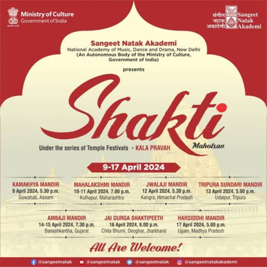 शक्ति उत्सव का उद्घाटन आज गुवाहाटी के कामाख्या मंदिर से होकर महाराष्ट्र कोल्हापुर के महालक्ष्मी मंदिर, कांगड़ा हिमाचल प्रदेश के ज्वालामुखी मंदिर, त्रिपुरा के त्रिपुर सुंदरी मंदिर बनासकांठा गुजरात के अंबाजी मंदिर, देवघर झारखंड के जय दुर्गा शक्तिपीठ में जारी रहेगा। उत्सव का समापन उज्जैन मध्य प्रदेश के शक्तिपीठ मां हरसिद्धि मंदिर में 17 अप्रैल को होगा। प्रदर्शन कला की राष्ट्रीय अकादमी और भारत सरकार के संस्कृति मंत्रालय की एक स्वायत्त संस्था संगीत नाटक अकादमी संगीत, नृत्य, नाटक, लोक और जनजातीय कला रूप और देश के अन्य संबद्ध कला रूपों के रूपमें व्यक्त देश के प्रदर्शन कला रूपों के संरक्षण, अनुसंधान, प्रचार और कायाकल्प की दिशा में काम कर रही है।
