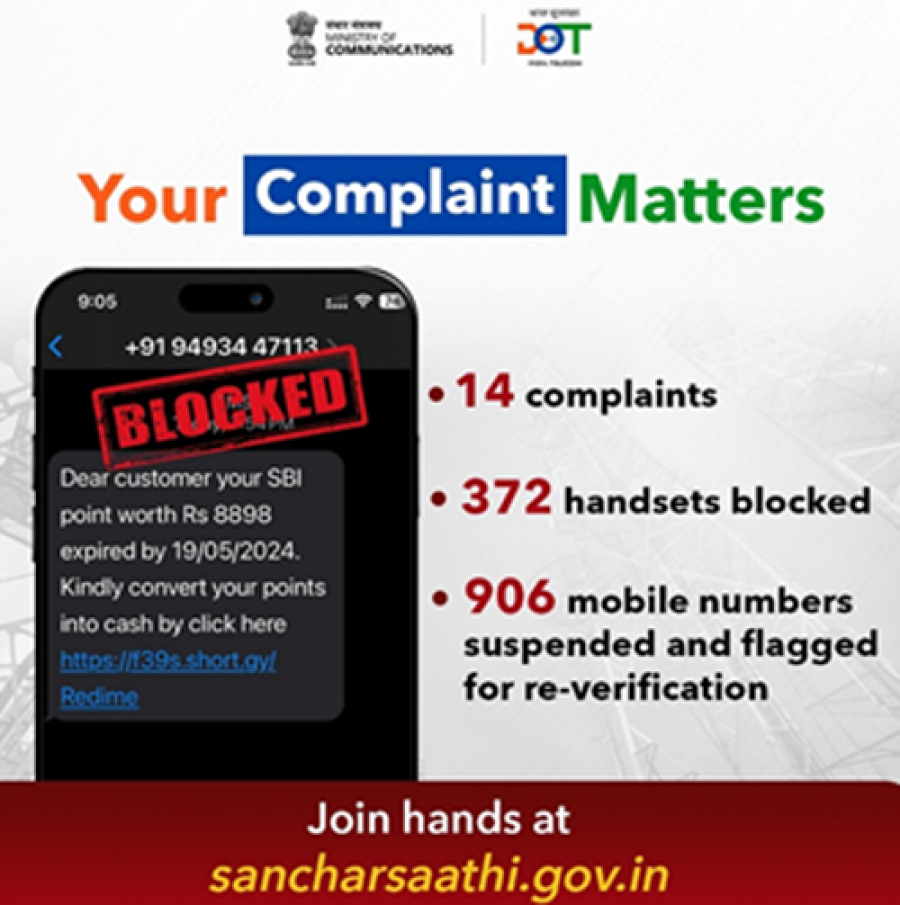 नई दिल्ली। दूरसंचार विभाग उन जागरुक नागरिकों केप्रति आभार व्यक्त कर रहा है, जो दूरसंचार विभाग को एक सुरक्षित और संरक्षित डिजिटल इको सिस्टम सुनिश्चित करने में सक्षम बनाते हैं। उनके द्वारा दी गई जानकारियों केसाथ दूरसंचार विभाग साइबर या वित्तीय धोखाधड़ी पर त्वरित और सख्त कार्रवाई कर रहा है। दूरसंचार विभाग का कहना हैकि सतर्क और जागरुक नागरिक साइबर अपराध रोकने में उल्लेखनीय भूमिका निभा रहे हैं एवं संचार साथी पोर्टल पर 'चक्षु रिपोर्ट संदिग्ध धोखाधड़ी संचार' सुविधा के जरिए संदिग्ध धोखाधड़ी संचार की अपनी सक्रिय रिपोर्टिंग से सुरक्षित डिजिटल माहौल में भी महत्वपूर्ण योगदान दे रहे हैं। नागरिकों की सतर्कता और तुरंत कार्रवाई न केवल उनको बल्कि अनगिनत अन्य लोगों को भी घोटालों, फिशिंग प्रयासों और धोखाधड़ी की गतिविधियों का शिकार होने से बचाती है।