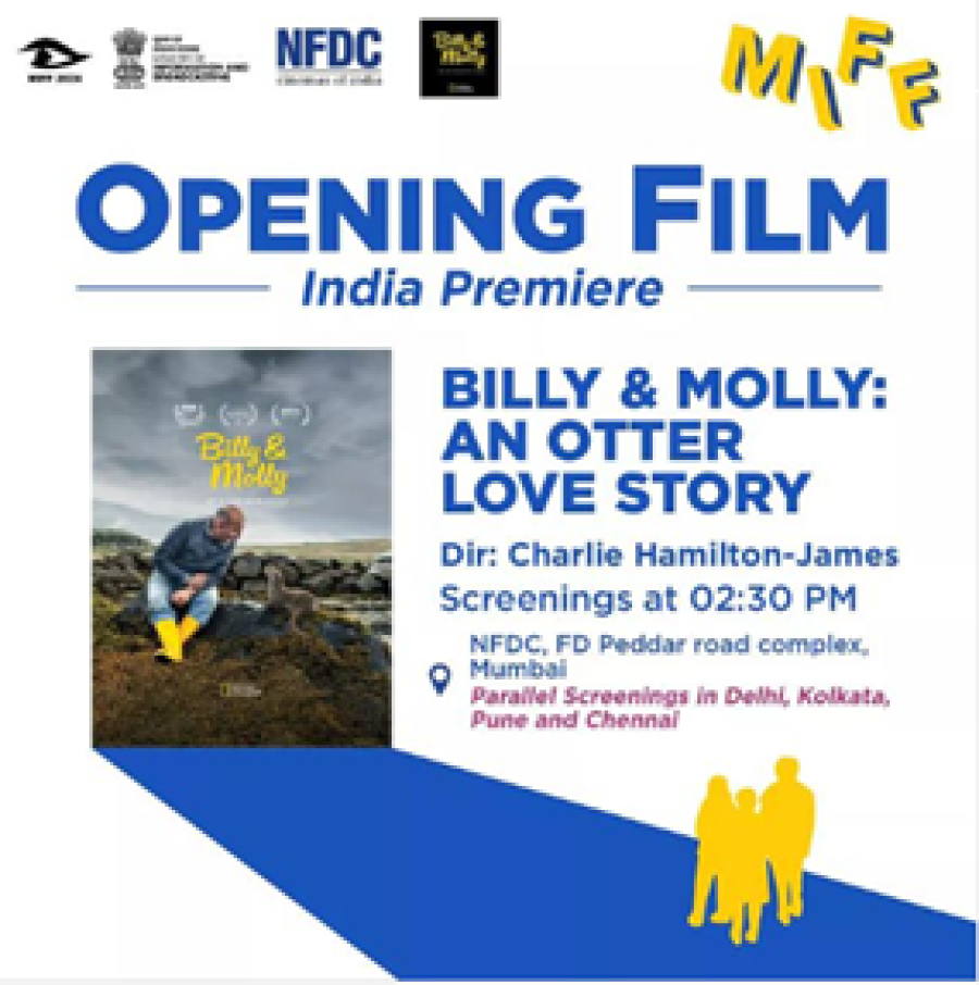 बिली एंड मौलीः एन ओटर लव स्टोरी फिल्म 15 जून को भारतीय सिनेमा के राष्ट्रीय संग्रहालय (एनएमआईसी) मुंबई के पेडर रोड में दोपहर 2:30 बजे प्रदर्शित की जाएगी। इस फिल्म को नई दिल्ली, चेन्नई, कोलकाता और पुणे में सिरी फोर्ट ऑडिटोरियम, एनएफडीसी टैगोर फिल्म सेंटर, सत्यजीत रे फिल्म एंड टेलीविजन इंस्टीट्यूट (एसआरएफटीआई) और नेशनल फिल्म आर्काइव ऑफ इंडिया में (15 जून दोपहर 2.30 बजे) एक ही समय में एक साथ प्रदर्शित किया जाएगा। चार्ली हैमिल्टन जेम्स एक प्रसिद्ध वन्यजीव फिल्म निर्माता हैं, उन्हें रचनात्मक वृत्तचित्रों ने प्रसिद्धी दिलाई और वे वन लाइफ वृत्तचित्र केलिए एमी पुरस्कार से सम्मानित किए जा चुके हैं। उन्होंने माई हैल्सन रिवर केसाथ अपने निर्देशन की शुरुआत की और एमेजन में जगह खरीदी तथा वहां के रोमांच को वृत्तचित्र लघु श्रृंखला आई बॉट ए रेनफॉरेस्ट में प्रदर्शित किया। मुंबई अंतर्राष्ट्रीय फिल्म महोत्सव की दक्षिण एशिया में गैर-फीचर फिल्मों केलिए सबसे पुराने और सबसे बड़े फिल्म समारोह की मान्यता प्राप्त है।