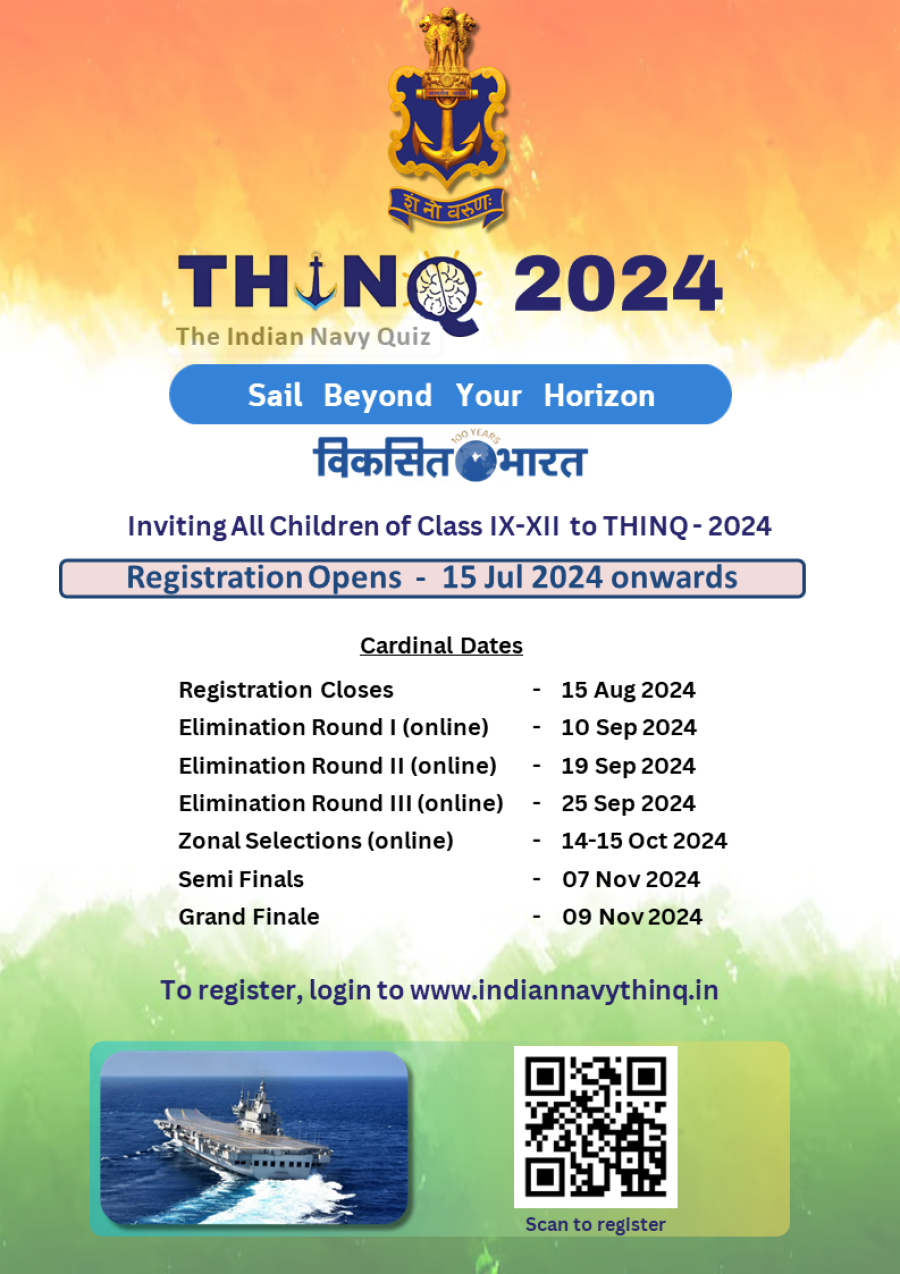 नई दिल्ली। भारतीय नौसेना ने अपने प्रमुख कार्यक्रम थिंक-2024 भारतीय नौसेना क्विज़ के शुभारंभ की घोषणा कर दी है। यह एक विशिष्ट राष्ट्रीय स्तर की क्विज़ प्रतियोगिता है। यह आयोजन बौद्धिक विकास को बढ़ावा देने और युवा मस्तिष्क को प्रेरित करने का एक विशिष्ट अवसर प्रदान करने के साथ-साथ ही हमारी समृद्ध सांस्कृतिक विरासत पर गर्व करने और देशभक्ति की भावना भी बढ़ावा देता है। पहले दो संस्करणों यानी थिंक-22 और जी-20 थिंक (जिसमें पिछले साल जी-20 देशों ने भाग लिया) की शानदार सफलता ने भारतीय नौसेना को यह पहल जारी रखने केलिए प्रोत्साहित किया है।