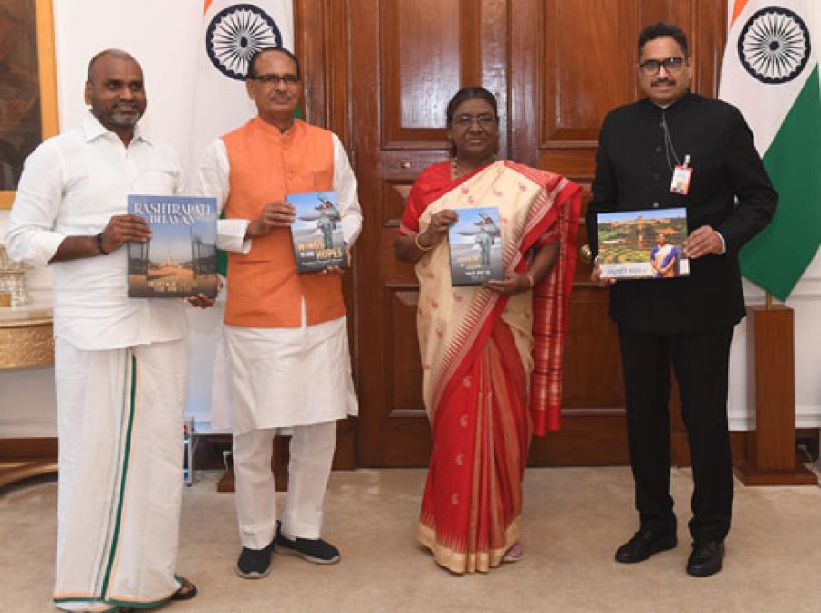 नई दिल्ली। केंद्रीय कृषि मंत्री शिवराज सिंह चौहान और सूचना एवं प्रसारण व संसदीय कार्य राज्यमंत्री डॉ एल मुरुगन व सूचना एवं प्रसारण सचिव संजय जाजू ने राष्ट्रपति भवन के सांस्कृतिक केंद्र में एक कार्यक्रम में ‘विंग्स टू अवर होप्स’, ‘आशाओं की उड़ान’, ‘कहानी राष्ट्रपति भवन की’ और ‘राष्ट्रपति भवन: हेरिटेज मीट्स द प्रेजेंट’ पुस्तक का विमोचन किया, जिनकी प्रथम प्रतियां राष्ट्रपति द्रौपदी मुर्मु को प्रदान की गईं। इन पुस्तकों को प्रकाशन निदेशालय ने प्रकाशित किया है। ‘विंग्स टू अवर होप्स और आशाओं की उड़ान’ पुस्तक राष्ट्रपति द्रौपदी मुर्मु के राष्ट्रपतिकाल के पहले वर्ष के दौरान उनके चुनिंदा भाषणों का संग्रह है, जबकि ‘कहानी राष्ट्रपति भवन की’ पुस्तक बच्चों पर आधारित है, जिसमें राष्ट्रपति भवन और राष्ट्रपति द्रौपदी मुर्मु की सरल भाषा में रोचक जानकारियां हैं। ‘राष्ट्रपति भवन: हेरिटेज मीट्स द प्रेजेंट’ पुस्तक राष्ट्रपति भवन के इतिहास और वास्तुकला का एक सचित्र निरूपण है, जो सभी पूर्व राष्ट्रपतियों के बारेमें जानकारी देती है।