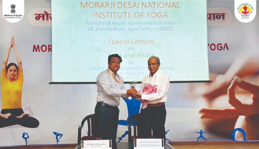 नई दिल्ली। योग और आहार के महत्व पर मोरारजी देसाई राष्ट्रीय योग संस्थान (एमडीएनआईवाई) नई दिल्ली और जयपुर के राष्ट्रीय आयुर्वेद संस्थान (एनआईए) के आयोजित विशेष व्याख्यान में विशेषज्ञों ने योग और आहार के महत्व पर बहुमूल्य अंतर्दृष्टि और व्यावहारिक सुझाव साझा किए। एनआईए जयपुर में प्रोफेसर रहे एवं आयुर्वेदिक चिकित्सा के विशेषज्ञ सम्मानित वैद्य प्रोफेसर कमलेश कुमार शर्मा ने व्याख्यान में छांदोग्य उपनिषद का उल्लेख करते हुए कहाकि अन्न साक्षात ईश्वर है, यह ईंधन है, लेकिन अन्न को लेकर हमारी दृष्टि भी महत्वपूर्ण है, जब आहार संतुलित तरीके से ग्रहण किया जाता है और आहार के लक्ष्य पूरे होते हैं तभी योग पूरा होता है।