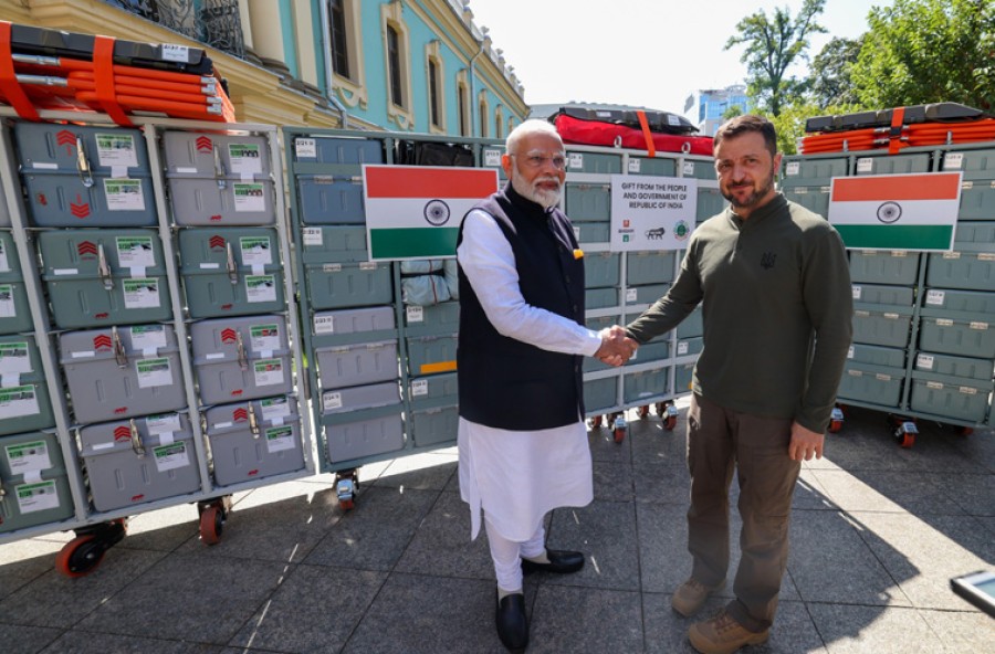 कीव। प्रधानमंत्री नरेंद्र मोदी ने यूक्रेन के राष्ट्रपति व्लोडिमिर जेलेंस्की के निमंत्रण पर 23 अगस्त-24 को यूक्रेन की यात्रा की। गौरतलब हैकि वर्ष 1992 में भारत और यूक्रेन केबीच राजनयिक संबंध स्थापित होने केबाद से यह किसी भारतीय प्रधानमंत्री की यूक्रेन की पहली यात्रा थी। प्रधानमंत्री नरेंद्र मोदी फोर्स वन ट्रेन से 10 घंटे की यात्रा केबाद यूक्रेन की राजधानी कीव पहुंचे। यूक्रेन के राष्ट्रपति व्लोडिमिर जेलेंस्की ने मैरीन्स्की पैलेस में प्रधानमंत्री नरेंद्र मोदी की गर्मजोशी से अगवानी करते हुए उनका जोरदार स्वागत किया। दोनों राजनेताओं ने भारत-यूक्रेन केबीच द्विपक्षीय संबंधों के सभी पहलुओं पर चर्चा की और आपसी हित के क्षेत्रीय एवं वैश्विक मुद्दों पर विचारों का आदान-प्रदान किया। इसके बाद एक संयुक्त वक्तव्य में दोनों राजनेताओं ने भविष्य में द्विपक्षीय संबंधों को व्यापक साझेदारी से बढ़ाकर रणनीतिक साझेदारी तक लेजाने की दिशा में काम करने केप्रति पारस्परिक रुचि व्यक्त की। उन्होंने आपसी विश्वास, सम्मान एवं खुलेपन से दोनों देशों के लोगों के लाभ केलिए द्विपक्षीय संबंधों को और अधिक विकसित करने केप्रति अपनी प्रतिबद्धता को दोहराया।