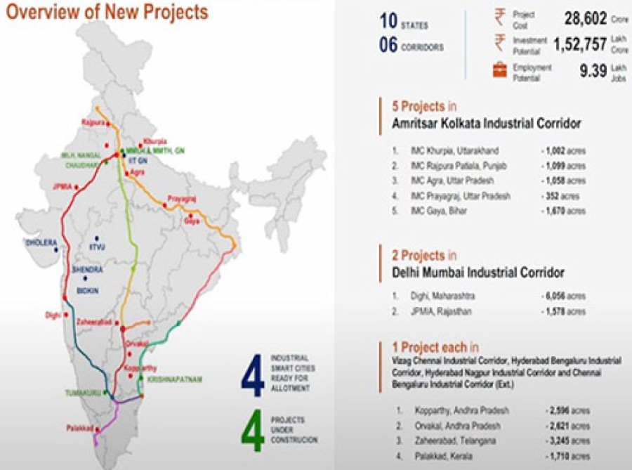 ये औद्योगिक क्षेत्र उत्तराखंड में खुरपिया, पंजाब में राजपुरा-पटियाला, महाराष्ट्र में दिघी, केरल में पलक्कड़, उत्तर प्रदेश में आगरा और प्रयागराज, बिहार में गया, तेलंगाना में जहीराबाद, आंध्र प्रदेश में ओरवाकल एवं कोप्पर्थी और राजस्थान में जोधपुर पाली में हैं। नए परियोजना प्रस्तावों की मुख्य विशेषताओं के अंतर्गत एनआईसीडीपी को बड़े एंकर उद्योगों और सूक्ष्म, लघु एवं मध्यम उद्यमों दोनों से निवेश की सुविधा प्रदान करके एक जीवंत औद्योगिक इकोसिस्टम को बढ़ावा देने केलिए तैयार किया गया है। ये औद्योगिक नोड 2030 तक 2 ट्रिलियन डॉलर निर्यात प्राप्त करने केलिए उत्प्रेरक के रूपमें कार्य करेंगे, जो सरकार के आत्मनिर्भर और वैश्विक रूपसे प्रतिस्पर्धी भारत के विजन को दर्शाता है। नए औद्योगिक शहरों को वैश्विक मानकों के ग्रीनफील्ड स्मार्ट शहरों के रूपमें विकसित किया जाएगा, जिन्हें 'प्लग-एन-प्ले' और 'वॉक-टू-वर्क' अवधारणाओं पर मांग से पहले बनाया जाएगा। यह दृष्टिकोण सुनिश्चित करता हैकि शहर उन्नत बुनियादी ढांचे से लैस हों, जो टिकाऊ और कुशल औद्योगिक कार्यों का समर्थन करते हैं।