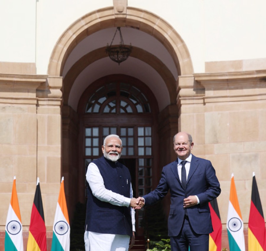 नई दिल्ली। प्रधानमंत्री नरेंद्र मोदी और जर्मनी के चांसलर ओलाफ़ स्कोल्ज़ ने आज हैदराबाद हाउस नई दिल्ली में संयुक्त प्रेस वार्ता की। इस दौरान दोनों देशों के मध्य कई महत्वपूर्ण समझौता का आदान-प्रदान भी किया गया। प्रधानमंत्री नरेंद्र मोदी ने चांसलर ओलाफ़ स्कोल्ज़ और उनके साथ आए प्रतिनिधिमंडल का भारत में हार्दिक स्वागत किया और कहाकि उन्हें ख़ुशी हैकि इन दो वर्ष में वे तीसरीबार चांसलर ओलाफ़ स्कोल्ज़ का भारत में स्वागत कर रहे हैं। नरेंद्र मोदी ने कहाकि भारत और जर्मनी की स्ट्रेटेजिक पार्टनरशिप की व्यापकता का अनुमान आप पिछले दो-तीन दिन की गतिविधियों से लगा सकते हैं। उन्होंने उल्लेख कियाकि आज सुबह जर्मनी के एशिया पैसिफिक बिज़नेस जगत की कांफ्रेंस को संबोधित किया, उनके तीसरे कार्यकाल की पहली आईजीसी मीटिंग संपन्न हुई है, सीईओ फोरम की बैठक में शामिल हुए, इसी समय जर्मन नौसेना शिप गोवा में पोर्ट कॉल कर रही है और खेल जगत भी पीछे नहीं है, दोनों देशों की हॉकी टीमों केबीच दोस्ताना मैच भी खेले जा रहे हैं।