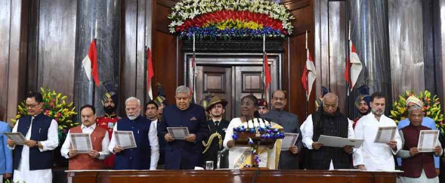 नई दिल्ली। राष्ट्रपति द्रौपदी मुर्मु ने संविधान अंगीकार किए जाने की 75वीं वर्षगांठ पर आज संविधान सदन में आयोजित भव्य समारोह में कहा हैकि संविधान भारत का सबसे पवित्र ग्रंथ है। उन्होंने कहाकि आज हम सभी एक ऐतिहासिक अवसर के भागीदार भी हैं और साक्षी भी, 75 वर्ष पहले आज हीके दिन संविधान सदन के इसी केंद्रीय कक्ष में संविधान सभा ने स्वतंत्र राष्ट्र के संविधान निर्माण का महती कार्य संपन्न किया था, उसी दिन संविधान सभा द्वारा हम भारत के लोगों ने संविधान को अंगीकार, अधिनियमित और स्वयं को समर्पित किया था। राष्ट्रपति ने कहाकि हमारा संविधान हमारे लोकतांत्रिक गणराज्य की सुदृढ़ आधारशिला है, हमारा संविधान हमारी सामूहिक और व्यक्तिगत गरिमा सुनिश्चित करता है। उन्होंने कृतज्ञ राष्ट्र की ओर से संविधान सभा के सदस्यों और पदाधिकारियों को श्रद्धांजलि अर्पित की और कहाकि यह देश का सौभाग्य हैकि संविधान सभा के अध्यक्ष डॉ राजेंद्र प्रसाद और प्रारूप समिति के अध्यक्ष बाबासाहेब डॉ भीमराव आंबेडकर ने संविधान निर्माण की प्रक्रिया का मार्गदर्शन किया। राष्ट्रपति, उपराष्ट्रपति जगदीप धनखड़, प्रधानमंत्री नरेंद्र मोदी, संसदीय कार्यमंत्री किरेन रिजिजू, लोकसभा अध्यक्ष ओम बिरला, राज्यसभा के उपसभापति हरिवंश नारायण सिंह और कांग्रेस अध्यक्ष मल्लिकार्जुन खड़गे एवं सदन में नेता प्रतिपक्ष राहुल गांधी ने संस्कृत और मैथिली भाषा में संविधान की प्रतियां जारी कीं, स्मारक डाक टिकट और स्मारक सिक्का भी जारी किया।