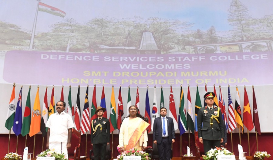 राष्ट्रपति द्रौपदी मुर्मु ने कहाकि भारतीय सशस्त्र बल देश की सीमाओं और क्षेत्रीय अखंडता की रक्षा करने में सबसे आगे हैं, हमसभी उनका बहुत सम्मान करते हैं। राष्ट्रपति ने कहाकि राष्ट्रीय हितों की निरंतर रक्षा करने में समर्पित सुरक्षा बलों पर हमें गर्व है और हमारे सशस्त्र बल, जो हमेशा राष्ट्र प्रथम की भावना केसाथ सेवा कर रहे हैं, उच्च प्रशंसा के पात्र हैं। राष्ट्रपति को यह जानकर खुशी हुईकि महिला अधिकारी भी बढ़चढ़कर अब तीनों सेनाओं में विभिन्न इकाइयों की कमान संभाल रही हैं। उन्होंने कहाकि सभी क्षेत्रोंमें महिलाओं की बढ़ती ताकत और भूमिका, विशेषकर युवा लड़कियों केलिए उत्साहजनक और प्रेरणादायक है। उन्होंने सशस्त्र बलों में अधिक से अधिक महिलाओं के शामिल होने की उम्मीद जताई, जहां वे असाधारण क्षमताओं का प्रदर्शन कर सकती हैं और नए क्षेत्रोंमें अपनी उपस्थिति दर्ज करा सकती हैं। डीएसएससी में प्रतिष्ठित स्टाफ पाठ्यक्रम केलिए चुने जानेवाले सशस्त्र बलों के भावी रक्षा अधिकारियों 26 मित्र देशों के 38 छात्र भी हैं। राष्ट्रपति ने आपसी सहयोग और संबंधों को मजबूत बनाने में अंतर्राष्ट्रीय छात्र अधिकारियों की भूमिका और उनके देशों केसाथ भारत के मित्रतापूर्ण गहरे संबंधों का उल्लेख किया।