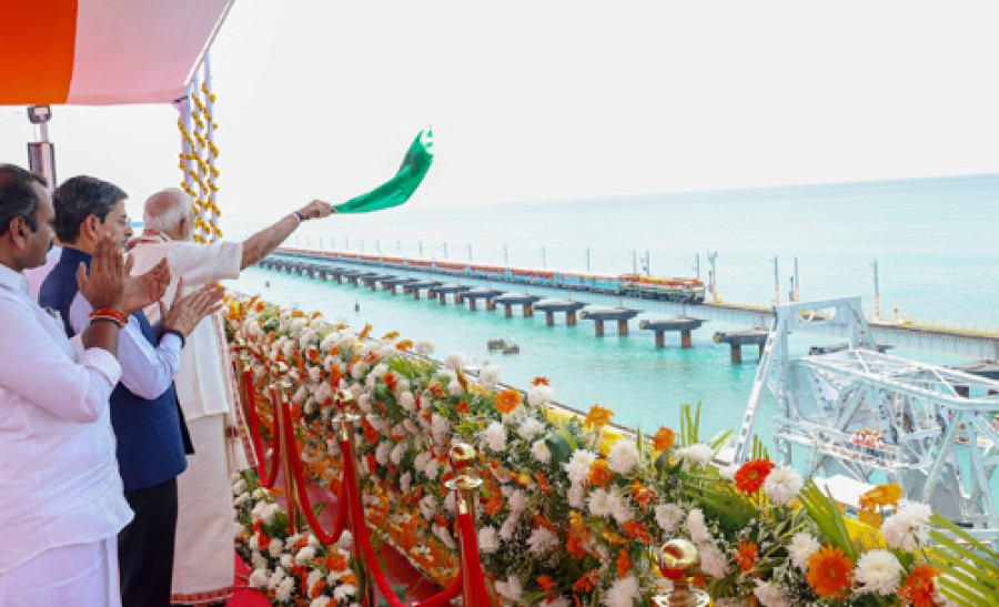 रामेश्वरम। प्रधानमंत्री नरेंद्र मोदी ने रामेश्वरम में भारत के पहले वर्टिकल लिफ्ट सी नए पंबन रेल ब्रिज पर आवागमन की शुरूआत करते हुए सड़क पुल से एक ट्रेन और एक जहाज को हरी झंडी दिखाकर रवाना करके पंबन रेल ब्रिज का संचालन देखा। गौरतलब हैकि पंबन रेल पुल का गहरा सांस्कृतिक महत्व है, रामायण के अनुसार राम सेतु का निर्माण रामेश्वरम केपास धनुषकोडी से शुरू हुआ था। रामेश्वरम को मुख्य भूमि से जोड़ने वाला यह पुल वैश्विक मंच पर भारतीय इंजीनियरिंग की उल्लेखनीय उपलब्धि का प्रतीक है। इसे 700 करोड़ रुपये से अधिक की लागत से बनाया गया है, इसकी लंबाई 2.08 किलोमीटर है, इसमें 99 स्पैन और 72.5 मीटर का वर्टिकल लिफ्ट स्पैन है, जो 17 मीटर की ऊंचाई तक उठता है, जिससे जहाजों की सुचारू आवाजाही की सुविधा मिलती है, साथही निर्बाध ट्रेन संचालन सुनिश्चित होता है। स्टेनलेस स्टील सुदृढ़ीकरण, उच्च श्रेणी के सुरक्षात्मक पेंट और पूरी तरहसे वेल्डेड जोड़ों से निर्मित पुल में अधिक स्थायित्व और कम रखरखाव की आवश्यकता है। इसे भविष्य की मांगों के अनुरूप दोहरी रेल पटरियों केलिए डिज़ाइन किया गया है। विशेष पॉलीसिलोक्सेन कोटिंग इसे जंग से बचाती है, जिससे कठोर समुद्री वातावरण में दीर्घायु सुनिश्चित होती है।