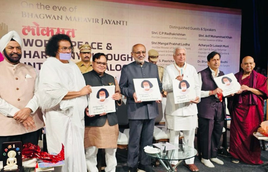मुंबई। विख्यात जैन आचार्य लोकेश ने कहा हैकि भगवान महावीर का दर्शन अपनाने से विश्वशांति और सद्भावना संभव है और जैन सिद्धांतों में युद्ध, हिंसा, पर्यावरण प्रदूषण, असमानता जैसी वैश्विक समस्याओं का समाधान समाहित है। भगवान महावीर जन्मकल्याणक पर मुंबई के प्रभादेवी रविंद्र नाट्य मंदिर सभागार में लोकमत मीडिया ग्रुप एवं अहिंसा विश्व भारती संस्था के संयुक्त तत्वावधान में ‘अंतरधार्मिक संवाद विश्वशांति सद्भावना’ हुआ था, जिसमें जैन आचार्य लोकेश ने यह बात कही। महाराष्ट्र के राज्यपाल सीपी राधाकृष्णन और बिहार के राज्यपाल डॉ आरिफ मोहम्मद खान, विख्यात विश्वशांति दूत जैन आचार्य लोकेश, महाराष्ट्र के मंत्री मंगल प्रभात लोढ़ा, बौद्ध भिक्षु भदंत राहुल बौधि और पूर्व डीजीपी पीएस पसरिचा ने संयुक्त रूपसे यह संवाद आरंभ किया।