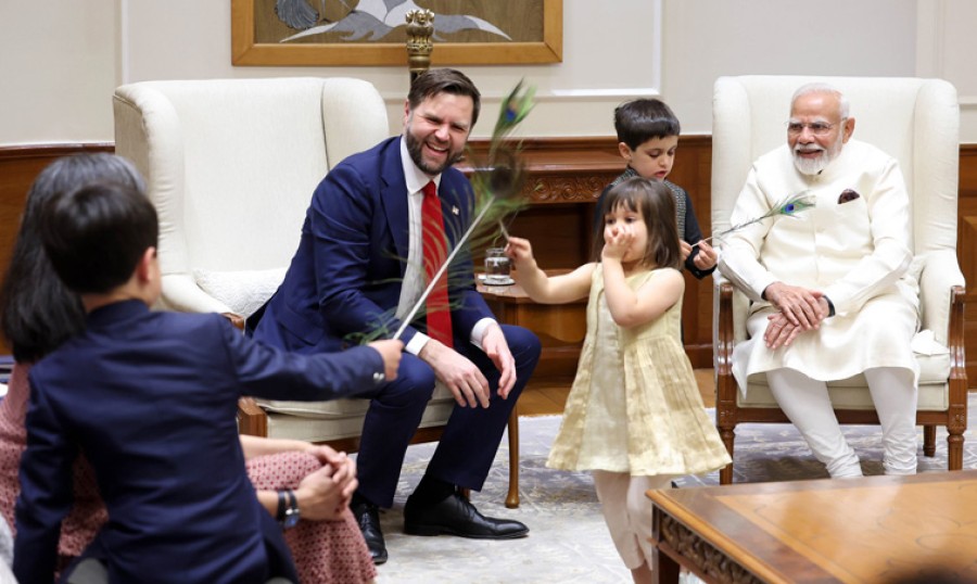 नई दिल्ली। प्रधानमंत्री नरेंद्र मोदी ने संयुक्तराज्य अमरीका के उपराष्ट्रपति जेडी वेंस, उनकी पत्नी उषा वेंस और उनके बच्चों की प्रधानमंत्री आवास दिल्ली में गर्मजोशी से मेजबानी की। प्रधानमंत्री के साथ जेडी वेंस परिवार की यह मुलाकात मधुरता और अपनत्व से सराबोर दिखी। प्रधानमंत्री ने जेडी वेंस के तीनों बच्चों को लाड़-प्यार किया, उन्हें प्रधानमंत्री आवास दिखाया और उन्हें मोर पंख जैसे प्यारे उपहार भी भेंट किए। उपराष्ट्रपति जेडी वेंस भारत की आधिकारिक यात्रा पर हैं, लेकिन ऐसा लग रहा जैसेकि वे घर पर अपने परिवार से मिल रहे हों, ऐसे प्यारे पल तस्वीरों में कैद हो गए।