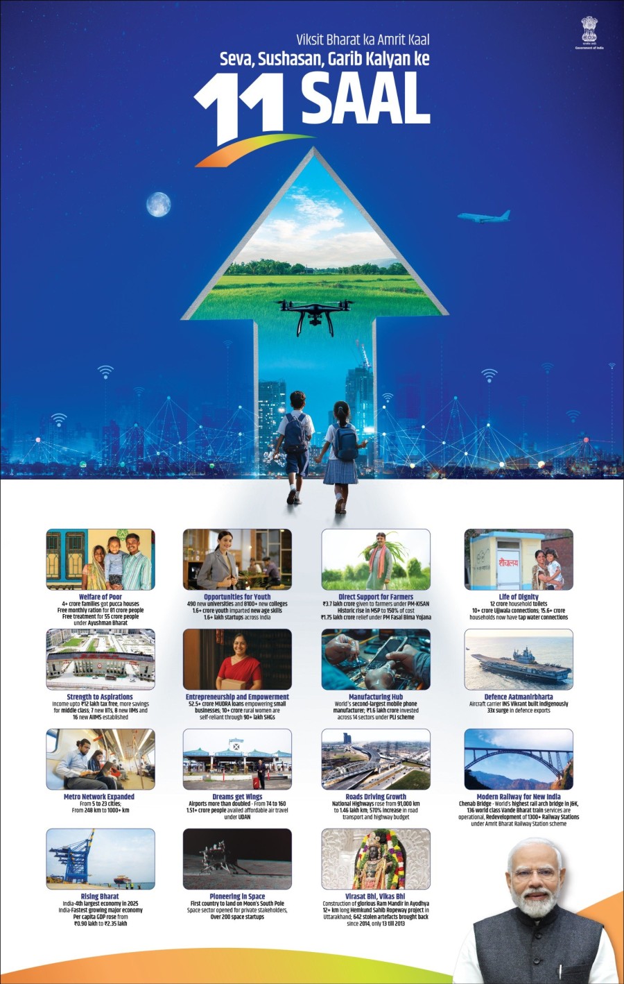 नई दिल्ली। प्रधानमंत्री नरेंद्र मोदी ने देश में एनडीए सरकार के 11 वर्ष के कार्यकाल में हुए तेज विकास और समृद्धि के उल्लेखनीय परिवर्तनों को एक्स पर पोस्ट करके साझा किया है। नरेंद्र मोदी ने कहाकि 140 करोड़ देशवासियों की सामूहिक भागीदारी से सुशासन और परिवर्तन पर स्पष्ट ध्यान दिए जाने से विभिन्न क्षेत्रोंमें तेजीसे प्रगति हुई है। प्रधानमंत्री ने कहाकि 'सबका साथ, सबका विकास, सबका विश्वास, सबका प्रयास' के सिद्धांत से प्रेरित होकर एनडीए सरकार ने तेजीसे और संवेदनशीलता केसाथ देशमें युगांतकारी परिवर्तन किए हैं। उन्होंने कहाकि आर्थिक विकास से लेकर सामाजिक उत्थान तक सरकार ने जनकेंद्रित, समावेशी और सर्वांगीण प्रगति को प्राथमिकता दी है।