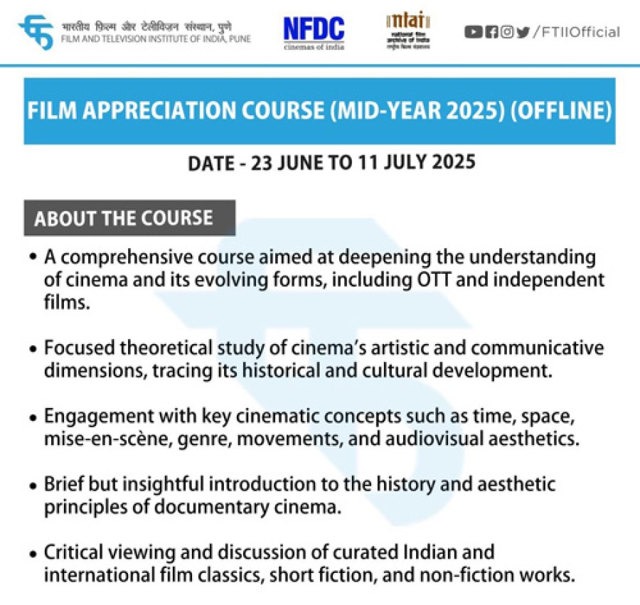 पुणे। भारत सरकार के सूचना एवं प्रसारण मंत्रालय केतहत भारतीय फिल्म एवं टेलीविजन संस्थान (एफटीआईआई) ने पुणे में आयोजित अपने प्रमुख फिल्म एप्रिसिएशन कोर्स मध्यवर्ष 2025 केलिए आवेदन की अंतिम तिथि बढ़ाने की घोषणा की है। आवेदन जमा करने की संशोधित अंतिम तिथि अब 15 जून 2025 (शाम 6:00 बजे) है। फिल्म एप्रिसिएशन कोर्स का आयोजन 23 जून से 11 जुलाई 2025 तक किया जाएगा। यह घोषणा देशभर के फिल्म प्रेमियों की भारी रुचि केबाद की गई है, ताकि अधिक से अधिक प्रतिभागि शामिल हो सकें, जो 7 जून की पिछली समयसीमा से चूक गए हैं। एफटीआईआई और राष्ट्रीय फिल्म विकास निगम एवं भारतीय राष्ट्रीय फिल्म अभिलेखागार का संयुक्त रूपसे संचालित पाठ्यक्रम एफटीआईआई की व्यापक लोकसंपर्क पहल का हिस्सा है, जिसका उद्देश्य भारतभर में फिल्म शिक्षा की पहुंच को लोकतांत्रिक बनाना है।