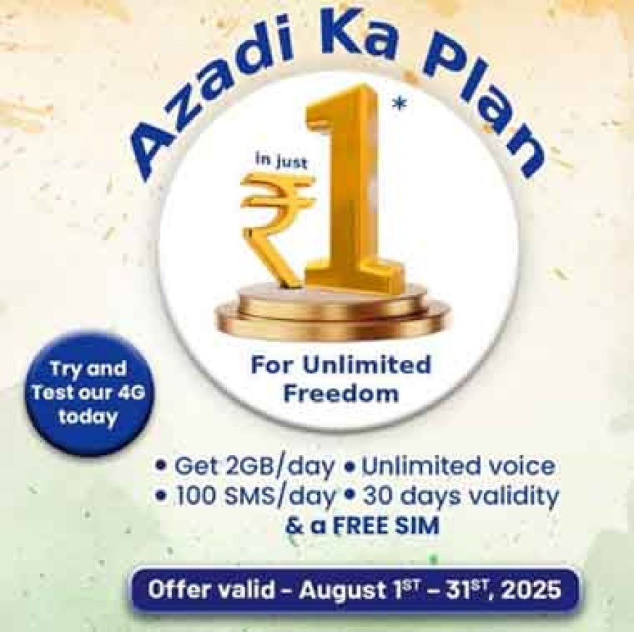 नई दिल्ली। भारत के सबसे बड़े दूरसंचार नेटवर्क भारत संचार निगम लिमिटेड (बीएसएनएल) ने मेड इन इंडिया 4G केसाथ सीमित अवधि केलिए 1 रुपए वाला 'फ्रीडम प्लान' लॉंच किया है। बीएसएनएल की यह पहल भारत के स्वतंत्रता दिवस पर है, जो बीएसएनएल उपभोक्ताओं को भारत की स्वदेशी रूपसे विकसित 4G तकनीक का बगैर किसी शुल्क के अनुभव करने का अवसर प्रदान करती है। स्वतंत्रता दिवस पर बीएसएनएल के इस आज़ादी आफर का जश्न मनाएं! बीएसएनएल उपभोक्ता पूरे एक माह तक बीएसएनएल की 4G मोबाइल सेवाओं का मुफ्त में इस्तेमाल कर सकते हैं। बीएसएनएल के प्लान में शामिल हैं-असीमित वॉयस कॉल (लोकल/ एसटीडी), प्रतिदिन 2 जीबी हाईस्पीड डेटा, प्रतिदिन 100 एसएमएस और एक बीएसएनएल सिम बिल्कुल मुफ़्त।