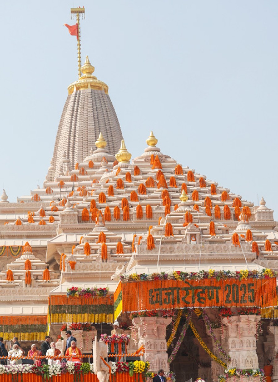 प्रधानमंत्री नरेंद्र मोदी ने बतायाकि जब भगवान श्रीराम ने रावण पर विजय की महान चुनौती का सामना किया तो रथ के पहिये वीरता और धैर्य थे, ध्वज सत्य और सदाचार था, अश्व बल, बुद्धि, संयम और परोपकार थे, लगाम क्षमा, करुणा और समता थी, जिसने रथ को सही दिशा में आगे बढ़ाया। प्रधानमंत्री ने कहाकि विकसित भारत की यात्रा को गति देने केलिए ऐसे रथ की आवश्यकता है, जिसके पहिए वीरता और धैर्य से संचालित हों अर्थात चुनौतियों का सामना करने का साहस और परिणाम प्राप्त होने तक अडिग रहने का धैर्य। उन्होंने कहाकि इस रथ का ध्वज सत्य और सर्वोच्च आचरण होना चाहिए अर्थात नीति, नीयत और नैतिकता से कभी समझौता नहीं किया जाना चाहिए। उन्होंने कहाकि इस रथ के घोड़े बल, बुद्धि, अनुशासन और परोपकार होने चाहिए अर्थात शक्ति, बुद्धि, संयम और दूसरों की सेवा करने की भावना होनी चाहिए। उन्होंने कहाकि इस रथ की लगाम क्षमा, करुणा और समता होनी चाहिए अर्थात सफलता में अहंकार नहीं होना चाहिए और असफलता में भी दूसरों केप्रति सम्मान होना चाहिए। नरेंद्र मोदी ने श्रद्धापूर्वक कहाकि यह क्षण कंधे से कंधा मिलाकर चलने, गति बढ़ाने और रामराज्य से प्रेरित भारत के निर्माण का है, यह तभी संभव है, जब राष्ट्रहित स्वार्थ से ऊपर रहे। इस भक्तिभाव से परिपूर्ण ऐतिहासिक कार्यक्रम में उत्तर प्रदेश की राज्यपाल आनंदीबेन पटेल, उत्तर प्रदेश के मुख्यमंत्री योगी आदित्यनाथ, श्रीराम जन्मभूमि तीर्थ क्षेत्र ट्रस्ट के अध्यक्ष महंत नृत्यगोपाल दास, संत समाज, भक्तगण, देश और दुनिया से कोटि-कोटि रामभक्त उपस्थित थे।