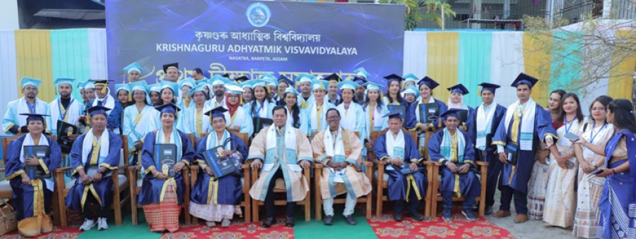 राज्यपाल लक्ष्मण प्रसाद आचार्य ने जतिन गोस्वामी के सम्मान की सराहना करते हुए कहाकि 93 वर्षीय महान गुरु की ऊर्जा और अनुशासन को देखना अत्यंत प्रेरणादायक था। उन्होंने कहाकि ऐसे व्यक्तित्व को सम्मानित करके न केवल व्यक्ति सम्मानित होता है, बल्कि संस्था भी सम्मानित होती है। प्रख्यात सतरिया नृत्य कलाकार और पद्मभूषण से सम्मानित जतिन गोस्वामी को भारतीय शास्त्रीय नृत्य, संस्कृति और आध्यात्मिक सौंदर्यशास्त्र में उनके आजीवन योगदान के सम्मान में मानद डॉक्टरेट से सम्मानित किया गया, जो असम की समृद्ध सांस्कृतिक विरासत के संरक्षण और संवर्धन में गोस्वामी की भूमिका को स्वीकार करती हैं। उन्होंने सर्बानंद सोनोवाल के भाषण की भी प्रशंसा की और कहाकि यह पारंपरिक राजनीतिक बयानबाजी के बजाय सादगी, ज्ञान की गहराई और ईमानदारी को दर्शाता है। इस अवसर पर विभिन्न विषयों के छात्रों को डॉक्टरेट, स्नातकोत्तर डिग्री और शैक्षणिक योग्यताएं प्रदान की गईं। उत्कृष्ट शैक्षणिक प्रदर्शन केलिए स्वर्ण पदक दिए गए। दीक्षांत समारोह में आध्यात्मिक गुरु कृष्ण श्रीश्री प्रेमानंद प्रभु, भक्तिमाता और कृष्णगुरु फाउंडेशन ट्रस्ट की अध्यक्ष कुंतला पटवारी गोस्वामी, कुलपति प्रोफेसर मोहनचंद्र कलिता, वरिष्ठ शिक्षाविद, न्यासी, छात्र और उनके परिजन भी उपस्थित थे।