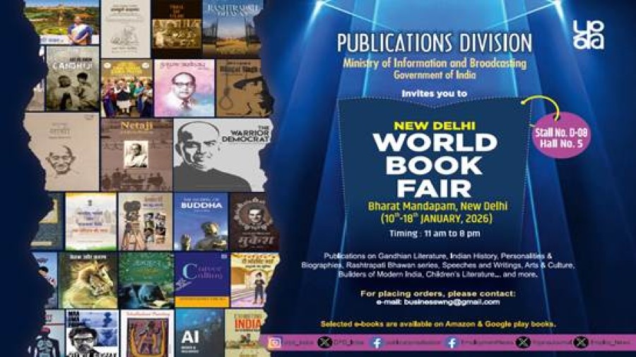 नई दिल्ली। सूचना एवं प्रसारण मंत्रालय का प्रकाशन विभाग दिल्ली विश्व पुस्तक मेले 2026 में भाग ले रहा है, जो आज से 18 जनवरी 2026 तक प्रगति मैदान नई दिल्ली में लग रहा है। नौ दिवसीय विश्व पुस्तक मेले का आयोजन केंद्रीय शिक्षा मंत्रालय के अधीन एक स्वायत्त संगठन राष्ट्रीय पुस्तक ट्रस्ट भारतीय व्यापार संवर्धन संगठन के सहयोग से कर रहा है। पुस्तक मेले की थीम-‘भारतीय सैन्य इतिहास: 75 वर्ष की वीरता और बुद्धिमत्ता’ के अनुरूप प्रकाशन विभाग अंग्रेजी, हिंदी और सभी भारतीय भाषाओं में पुस्तकों की विविध श्रृंखलाओं केसाथ आगंतुकों और पुस्तक प्रेमियों को आकर्षित करने केलिए तैयार है। आशा हैकि मेले में पेश की जा रही किताबें मेले में आनेवाले किताब प्रेमियों के मन को ज़रूर मोह लेंगी। मेले में कला और संस्कृति, इतिहास, सिनेमा, व्यक्तित्व और जीवनियां, भूमि और लोग, गांधीवादी साहित्य और बाल साहित्य आदि विविध विषयों पर पुस्तकें भी शामिल हैं।