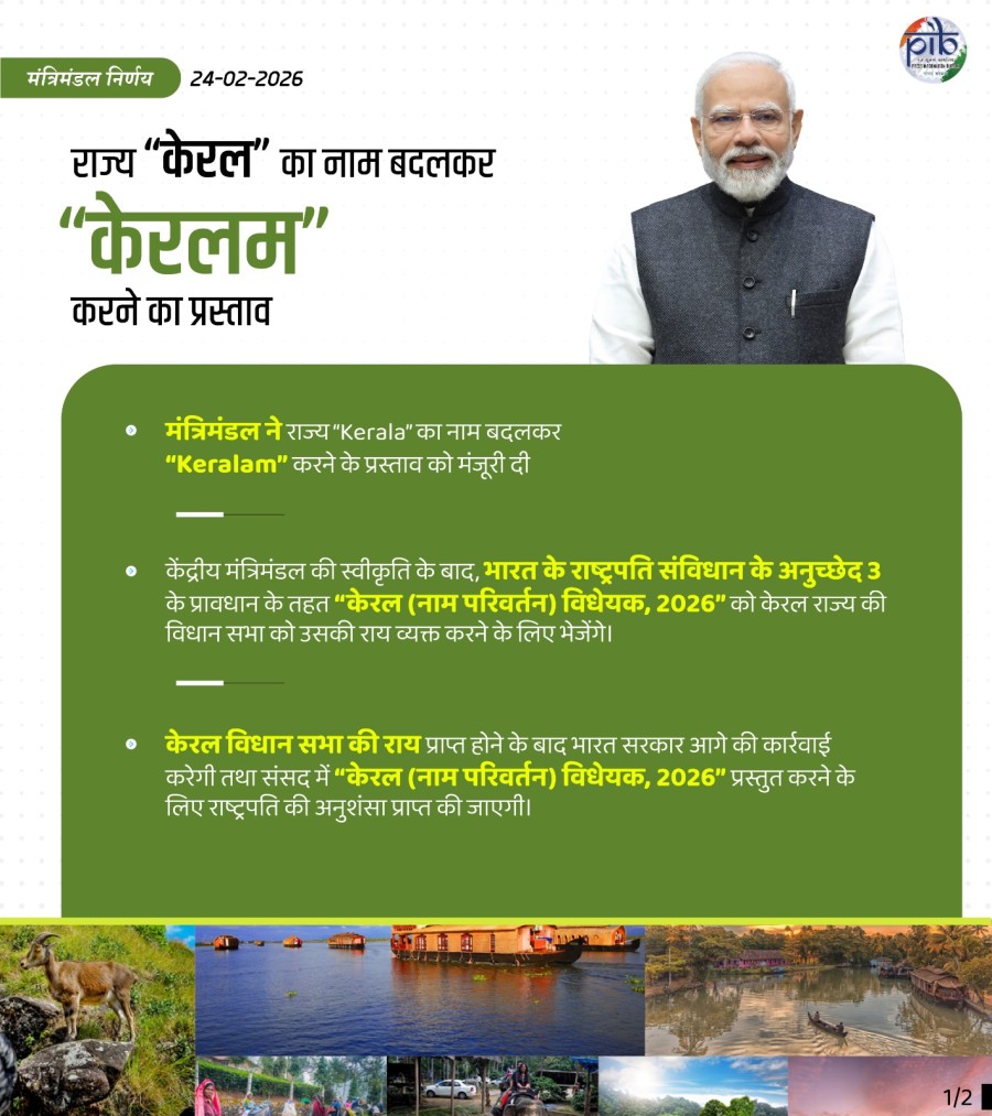 नई दिल्ली। नरेंद्र मोदी मंत्रिमंडल ने सेवा तीर्थ में प्रथम कैबिनेट बैठक में आज देश केलिए कई अभूतपूर्व निर्णय लिए। एक ऐतिहासिक निर्णय में केरल राज्य का नाम बदलकर 'केरलम' करने के प्रस्ताव को मंजूरी दे दी है। गौरतलब हैकि गृह मंत्रालय में केरल राज्य का नाम बदलकर 'केरलम' करने के विषय पर विचार करके गृहमंत्री अमित शाह की स्वीकृति से केरल राज्य का नाम बदलकर 'केरलम' करने केलिए मंत्रिमंडल के समक्ष मसौदा ज्ञापन को विधि एवं न्याय मंत्रालय के विधि मामलों और विधायी विभाग को उनकी टिप्पणियों केलिए भेजा गया था। विधि एवं न्याय मंत्रालय के विधि और विधायी विभाग ने केरल राज्य का नाम 'केरलम' करने के प्रस्ताव पर सहमति व्यक्त की है। केंद्रीय मंत्रिमंडल की स्वीकृति केबाद राष्ट्रपति द्वारा केरल (नाम परिवर्तन) विधेयक 2026 को केरल राज्य विधानसभा को संविधान के अनुच्छेद 3 के प्रावधान केतहत विचार विमर्श हेतु भेजा जाएगा। केरल राज्य विधानसभा की राय प्राप्त होने केबाद भारत सरकार आगे की कार्रवाई करेगी।