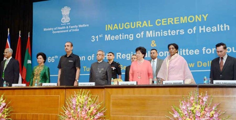 नई दिल्ली। राष्ट्रपति प्रणब मुखर्जी ने आज राष्ट्रपति भवन में दक्षिण पूर्व एशिया के स्वास्थ्य मंत्रियों तथा विश्व स्वास्थ्य संगठन की दक्षिण पूर्व एशिया की 66वीं क्षेत्रीय समिति की बैठक का उद्घाटन किया। इस अवसर पर राष्ट्रपति ने आशा व्यक्त की कि दक्षिण पूर्व एशिया क्षेत्र के स्वास्थ्य मंत्रियों तथा दक्षिण पूर्व एशिया के विश्व स्वास्थ्य संगठन की क्षेत्रीय समिति की बैठक से पूरे क्षेत्र में आगे बढ़ने का मानचित्र तैयार होगा। उन्होंने कहा कि क्षेत्र के लोगों के लिए अच्छी स्वास्थ्य सुविधा अच्छे माहौल में सुनिश्चित करना समय की आवश्यकता है, इसके लिए क्षेत्र की विभिन्न सरकारों को अपना-अपना दृष्टिकोण तय करना होगा।