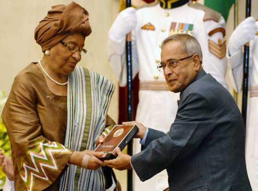 नई दिल्ली। राष्ट्रपति प्रणब मुखर्जी ने राष्ट्रपति भवन में वर्ष-2012 का इंदिरा गांधी शांति निशस्त्रीकरण और विकास पुरस्कार लाइबेरिया की राष्ट्रपति ऐलन जॉनसन सरलिफ को प्रदान किया। उन्हें यह पुरस्कार लाइबेरिया में शांति, लोकतंत्र, विकास, सुरक्षा और कानून व्यवस्था के क्षेत्र में उल्लेखनीय योगदान तथा भारत के साथ संबंधों को सुधारने की अनूठी पहल के मद्देनज़र दिया गया है।