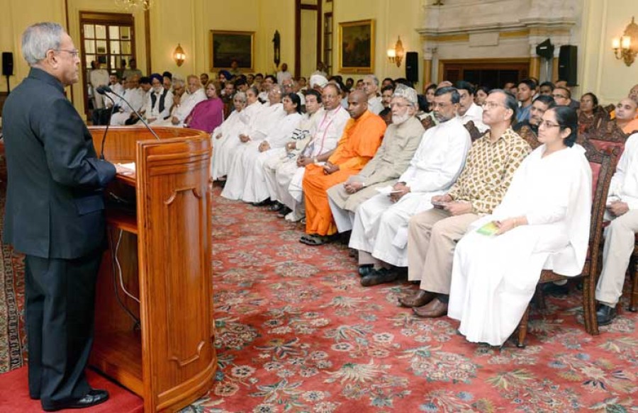 राष्ट्रपति ने कहा कि अखिल भारत, अखिल आस्था अभियान का उद्देश्य हिंसा मुक्त समाज बनाना है। उन्होंने कहा कि अहिंसा और शांति हमारी सभ्यता की प्राथमिक शिक्षा है, कोई धर्म हिंसा नहीं सिखाता, प्रत्येक धर्म प्रेम, करुणा और सेवा की शिक्षा देता है। प्रणब मुखर्जी ने कहा कि भारत की सभ्यता पांच हजार वर्ष पुरानी है, जहां भगवान बुद्ध और भगवान महावीर ने अहिंसा के उपदेश दिए, भारत हमेशा सभी आस्था, विश्वास, धर्मों और रीति-रिवाजों को मानता आया है।