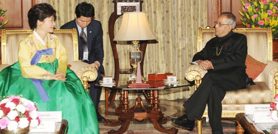 नई दिल्ली। कोरिया गणराज्य की राष्ट्रपति पार्क गेउन-हाई ने गुरूवार को राष्ट्रपति भवन में राष्ट्रपति प्रणब मुखर्जी से भेंट की। राष्ट्रपति ने उनके सम्मान में भोज का भी आयोजन किया। इससे पहले कोरियाई राष्ट्रपति की प्रधानमंत्री मनमोहन सिंह के साथ आपसी सहयोग सहित कई मामलों पर वार्ता हुई और समझौतों पर हस्ताक्षर हुए। कोरिया गणराज्य की राष्ट्रपति गेउन-हाई का स्वागत करते हुए राष्ट्रपति प्रणब मुखर्जी ने कहा कि राष्ट्रपति बनने के पहले ही साल में उनका भारत आना भारत के लिए खुशी की बात है। भारत सरकार दोनों देशों के बीच संबंधों में आए बदलाव को लेकर उत्साहित है। राष्ट्रपति ने कहा कि क्षेत्रीय और अंतर्राष्ट्रीय मुद्दों पर भारत और कोरिया के बीच विचारों की समानता बढ़ी है, दोनों देशों के बीच रणनीतिक साझेदारी का मूल सिद्धांत आर्थिक आदान-प्रदान है। भारत दोनों देशों के बीच व्यापार और निवेश बढ़ाने को लेकर उत्साहित है। राष्ट्रपति ने कहा कि भारत चाहेगा कि कोरिया भारत के भौतिक ढांचागत विकास में निवेश बढ़ाए।