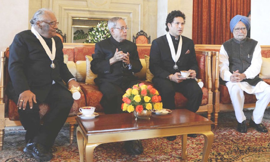 नई दिल्ली। राष्ट्रपति प्रणब मुखर्जी ने वैज्ञानिक प्रोफेसर सीएनआर राव और क्रिकेटर सचिन तेंदुलकर को आज नई दिल्ली में राष्ट्रपति भवन में आयोजित समारोह में भारत रत्न से विभूषित किया।इस अवसर पर भारत के उपराष्ट्रपति एम हामिद अंसारी, प्रधानमंत्री मनमोहन सिंह और यूपीए की अध्यक्ष सोनिया गांधी, भारत सरकार के वरिष्ठ मंत्री और आमंत्रित अतिथि उपस्थित थे।