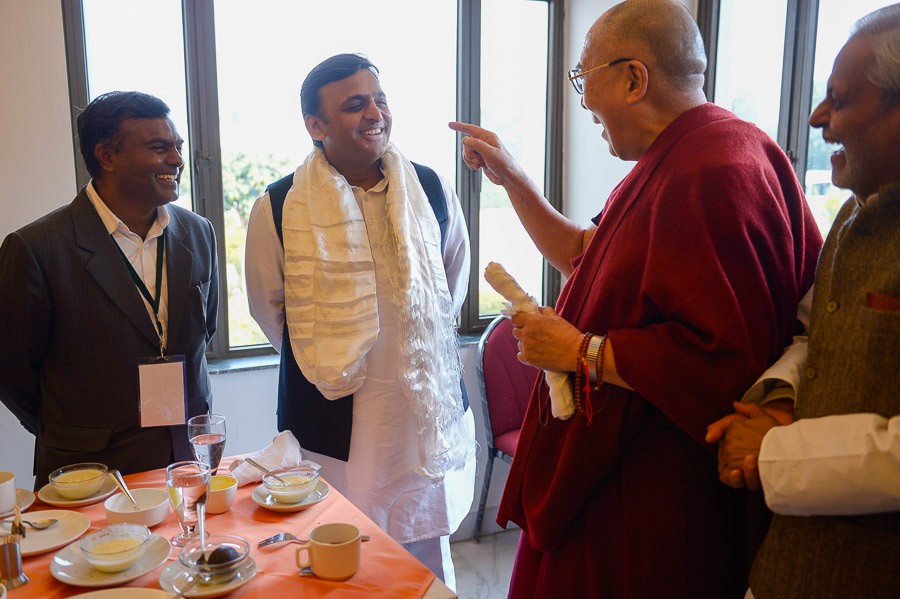 फर्रूखाबाद। उत्तर प्रदेश के मुख्यमंत्री अखिलेश यादव ने कहा है कि देश की तरक्की एवं खुशहाली के लिए सभी धर्म के लोगों को आपसी सद्भाव एवं एकता के साथ मिलजुलकर काम करने की जरूरत है। मुख्यमंत्री आज जनपद फर्रूखाबाद के संकिसा में बौद्ध धर्मगुरु परमपावन दलाई लामा से मुलाकात के बाद प्रेस प्रतिनिधियों से वार्ता कर रहे थे। मुख्यमंत्री ने दलाई लामा से मुलाकात कर उनका आशीर्वाद प्राप्त किया और उनके साथ भोजन भी किया।