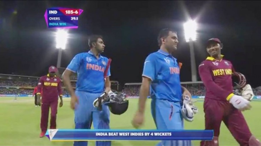 भारतीय टीम आईसीसी क्रिकेट विश्वकप के ग्रुप बी से क्वार्टर फाइनल में पहुंचने वाली पहली टीम बन गई है। भारत के चार मैच में आठ अंक हो गए हैं और अब उसके सामने आयरलैंड और जिम्बाब्वे जैसी टीमें हैं, जबकि वेस्टइंडीज को अंतिम आठ में पहुंचने के लिए पहले उसे यूएई से उसके अंतिम लीग मैच में उसपर बड़े अंतर से जीत दर्ज करनी होगी। वेस्टइंडीज के लिए इस मैच का सकारात्मक पक्ष यही है कि उसने अपना कम स्कोर होने के बावजूद भारत को पूरी तरह से एकतरफा जीत दर्ज नहीं करने दी। भारतीय सलामी बल्लेबाज भी अच्छी शुरुआत नहीं दे पाए और शिखर धवन एवं रोहित शर्मा बहुत कम स्कोर देकर पवेलियन लौट गए। सुरेश रैना को भी शॉर्ट पिच गेंदों से जूझना पड़ा, लेकिन उन्होंने ड्वेन स्मिथ की गेंद पर विकेट के पीछे कैच दे दिया। ऐसे ही रविंद्र जडेजा ने भी शॉर्ट पिच गेंद को बेवकूफी भरा पुल करके कैच दे दिया। खैर महेंद्र सिंह धोनी ने विजयी चौका जमाया। उनकी इस सफलता से यह आशा बलवती हुई है कि आगे के मैचों में महेंद्र सिंह धोनी का बल्ला चमकेगा। इस ग्रुप का अगला मैच मेलबर्न में होगा।