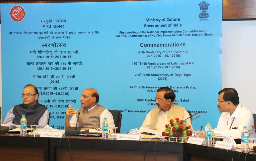 नई दिल्ली। केंद्रीय गृहमंत्री राजनाथ सिंह ने स्मरणोत्सवों के बारे में उच्चस्तरीय राष्ट्रीय कार्यांवयन समिति की पहली बैठक की अध्यक्षता की, जिसमें इस वर्ष के 'स्मरण उत्सव कार्यक्रमों' पर चर्चा की गई। बैठक में केंद्रीय वित्तमंत्री अरुण जेटली, केंद्रीय संस्कृति और नागर विमानन पर्यटन राज्यमंत्री डॉ महेश शर्मा, नागालैंड के राज्यपाल पीबी आचार्य और स्मरण समारोहों से जुड़े अन्य सदस्य भी मौजूद थे। बैठक के दौरान छह स्मरण समारोहों की तिथि और स्थान के बारे में विचार-विमर्श किया गया, जिनमें-रानी गाईदिनल्यू की जन्म शताब्दी, लाला लाजपत राय का 150वां जन्मदिन, तात्या टोपे का 200वां जन्मदिन, महाराणा प्रताप का 475वां जन्मदिन, भीष्म साहनी की जन्म शताब्दी और चैतन्य महाप्रभु की वृंदावन वापसी के 500 वर्ष शामिल हैं।