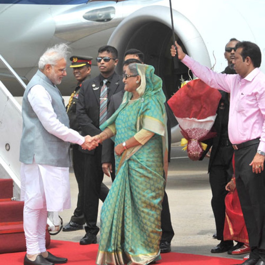 ढाका/ नई दिल्ली। प्रधानमंत्री नरेंद्र मोदी दो दिवसीय यात्रा पर आज बांग्लादेश पहुंचे। बांग्लादेश के हजरतशाह जलाल अंतर्राष्ट्रीय हवाई अड्डे पर उनका भव्य स्वागत किया गया। बांग्लादेश की उनकी इस पहली यात्रा के दौरान दोनों पक्ष सहयोग को आगे बढ़ाने के लिए कई समझौते करेंगे और काफी समय से लंबित भूमि सीमा समझौते की अभिपुष्टि भी करेंगे। प्रधानमंत्री नरेंद्र मोदी जब हजरतशाह जलाल अंतर्राष्ट्रीय हवाई अड्डे पर उतरे तो बांग्लादेश की प्रधानमंत्री शेख हसीना, वित्तमंत्री एएमए मुहीथ, वाणिज्य मंत्री तोफैल अहमद और कृषि मंत्री मोती चौधरी सहित कई मंत्रिमंडल सहयोगियों ने उनका स्वागत किया। हवाई अड्डे पर ही प्रधानमंत्री नरेंद्र मोदी को गार्ड ऑफ ऑनर भी दिया गया।