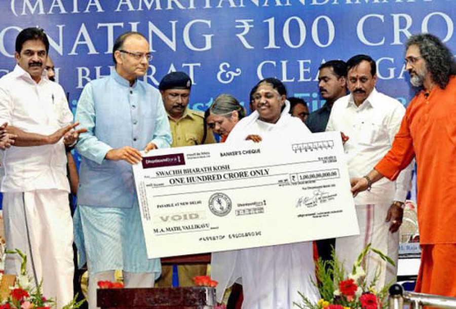 कोल्लम (केरल)। केरल में कोल्लम जिले के अमृतपुरी में आध्यात्मिक गुरू माता अमृतानंदमयी ने आज प्रधानमंत्री नरेंद्र मोदी के स्वच्छ भारत और नमामि गंगे परियोजना के तहत गंगा नदी के किनारे निर्धन गांवों में शौचालय निर्माण के लिए वित्तमंत्री अरुण जेटली को 100 करोड़ रूपए का चेक दिया। चेक प्राप्त करने के अवसर पर वित्तमंत्री अरुण जेटली ने कहा है कि केंद्र सरकार आगामी 3 से 4 वर्ष में स्वच्छ भारत अभियान के समान नमामि गंगे परियोजना को बड़ी सफलता दिलाने के लिए प्रतिबद्ध है। उन्होंने कहा कि चालीस प्रतिशत भारतीय लोग गंगा नदी पर निर्भर हैं और पवित्र नदी को साफ करने के लिए करोड़ों रूपए खर्च किए जा चुके हैं। उन्होंने कहा कि स्वच्छ भारत अभियान के पहले चरण में सभी स्कूलों में शौचालय के निर्माण के लक्ष्य को बेहद सफलता मिली है और सभी घरों मे शौचालय प्रदान करने के प्रयास किए जा रहे हैं।
