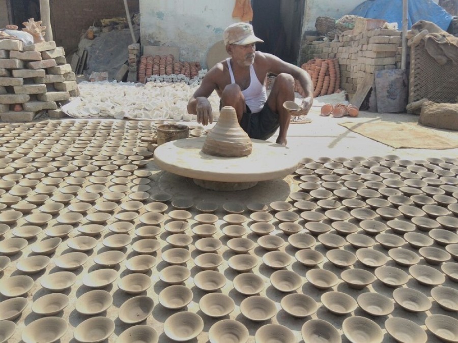 कुम्‍भकार परिवार एक स्‍थान पर अपने मकान की छत पर मिट्टी के दीये बनाने में जुटा है, सूख जाने पर इन्हें आवे में लगा दिया जाएगा और ये बाजार में भेज दिए जाएंगे। इस परिवार को आशा है कि सोने-चांदी की बिक्री के बीच उसके दीये भी बिक जाएंगे, जिनसे उसके यहां भी दीवाली होगी। देश में कुम्हारी कला का एक निराशाजनक पक्ष यह है कि कुम्हारों की खदानों पर महल खड़े हो गए हैं और उन्हें मिट्टी के बर्तनों के लिए अब वैसी मिट्टी और खदान नहीं मिल रही है, जो मिट्टी के खूबसूरत बर्तनों के लिए जरूरी है। आबादी क्या बढ़ रही है, उसके अदृश्य दुष्परिणामों की यह भी एक बानगी है। देशवासियों ने कुछ परंपराओं से मुंह मोड़ लिया है और वे इस तथ्य को भूल गए हैं कि हमारे देश के तीज त्योहार यदि उनकी खुशी के लिए हैं तो उनपर अनेक लोगों का जीवन-यापन भी निर्भर है।